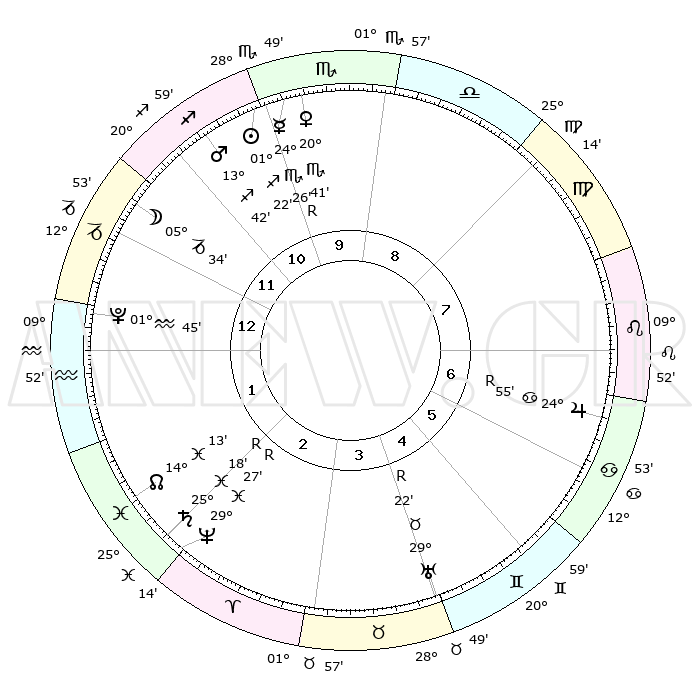 | | ΘΕΣΕΙΣ ΠΛΑΝΗΤΩΝ ΑΣΤΡΟΛΟΓΙΚΟΥ ΧΑΡΤΗ ΤΗΣ ΣΤΙΓΜΗΣ ΑΥΤΗΣ | | | | Πλανήτης | Ζώδιο | Μοίρες | Δεκαήμ. | Σε οίκο | Απόκλιση | | Ακμές των οίκων | | Ηλιος | Τοξότης | 01°18' | Πρώτο | 11 | 20 S 25 | | 1ος | 12°31' | Αιγόκερως | | Σελήνη | Αιγόκερως | 04°46' | Πρώτο | 12 | 28 S 03 | | 2ος | 22°52' | Υδροχόος | | Ερμής | Σκορπιός | 24°30'R | Τρίτο | 10 | 17 S 28 | | 3ος | 03°06' | Κριός | | Αφροδίτη | Σκορπιός | 20°36' | Τρίτο | 10 | 16 S 58 | | 4ος | 04°48' | Ταύρος | | Αρης | Τοξότης | 13°39' | Δεύτερο | 11 | 23 S 02 | | 5ος | 29°19' | Ταύρος | | Δίας | Καρκίνος | 24°55'R | Τρίτο | 7 | 21 N 17 | | 6ος | 20°35' | Δίδυμοι | | Κρόνος | Ιχθείς | 25°18'R | Τρίτο | 2 | 04 S 04 | | 7ος | 12°31' | Καρκίνος | | Ουρανός | Ταύρος | 29°22'R | Τρίτο | 5 | 19 N 48 | | 8ος | 22°52' | Λέων | | Ποσειδώνας | Ιχθείς | 29°27'R | Τρίτο | 2 | 01 S 28 | | 9ος | 03°06' | Ζυγός | | Πλούτωνας | Υδροχόος | 01°45' | Πρώτο | 1 | 23 S 26 | | 10ος | 04°48' | Σκορπιός | | Β. Δεσμός | Ιχθείς | 14°13' | Δεύτερο | 2 | 06 S 13 | | 11ος | 29°19' | Σκορπιός | | Ωροσκόπος | Αιγόκερως | 12°31' | Δεύτερο | | | 12ος | 20°35' | Τοξότης | | Μεσουράνημα | Σκορπιός | 04°48' | Πρώτο | | | |