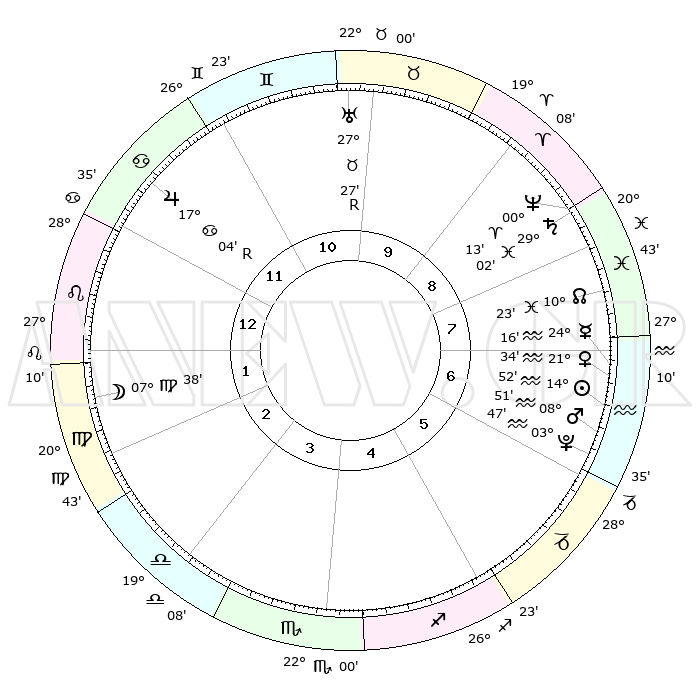 | | ΘΕΣΕΙΣ ΠΛΑΝΗΤΩΝ ΑΣΤΡΟΛΟΓΙΚΟΥ ΧΑΡΤΗ ΤΗΣ ΣΤΙΓΜΗΣ ΑΥΤΗΣ | | | | Πλανήτης | Ζώδιο | Μοίρες | Δεκαήμ. | Σε οίκο | Απόκλιση | | Ακμές των οίκων | | Ηλιος | Υδροχόος | 14°47' | Δεύτερο | 7 | 16 S 24 | | 1ος | 04°50' | Λέων | | Σελήνη | Παρθένος | 06°35' | Πρώτο | 2 | 09 N 18 | | 2ος | 26°13' | Λέων | | Ερμής | Υδροχόος | 24°08' | Τρίτο | 7 | 15 S 04 | | 3ος | 21°56' | Παρθένος | | Αφροδίτη | Υδροχόος | 21°29' | Τρίτο | 7 | 15 S 40 | | 4ος | 23°31' | Ζυγός | | Αρης | Υδροχόος | 08°47' | Πρώτο | 7 | 19 S 04 | | 5ος | 29°24' | Σκορπιός | | Δίας | Καρκίνος | 17°04'R | Δεύτερο | 12 | 22 N 39 | | 6ος | 04°19' | Αιγόκερως | | Κρόνος | Ιχθείς | 29°01' | Τρίτο | 9 | 02 S 23 | | 7ος | 04°50' | Υδροχόος | | Ουρανός | Ταύρος | 27°27'R | Τρίτο | 10 | 19 N 24 | | 8ος | 26°13' | Υδροχόος | | Ποσειδώνας | Κριός | 00°13' | Πρώτο | 9 | 01 S 07 | | 9ος | 21°56' | Ιχθείς | | Πλούτωνας | Υδροχόος | 03°47' | Πρώτο | 6 | 23 S 00 | | 10ος | 23°31' | Κριός | | Β. Δεσμός | Ιχθείς | 10°23' | Δεύτερο | 8 | 07 S 40 | | 11ος | 29°24' | Ταύρος | | Ωροσκόπος | Λέων | 04°50' | Πρώτο | | | 12ος | 04°19' | Καρκίνος | | Μεσουράνημα | Κριός | 23°31' | Τρίτο | | | |