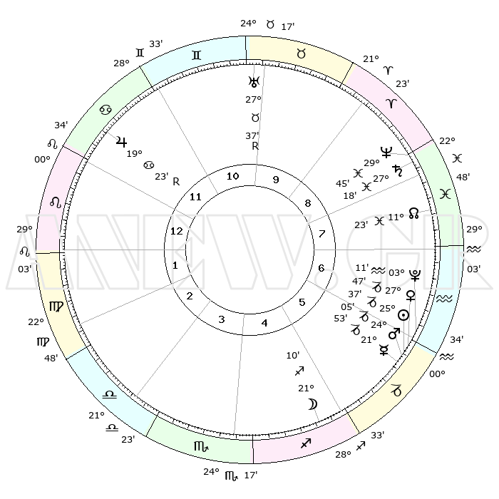 | | ΘΕΣΕΙΣ ΠΛΑΝΗΤΩΝ ΑΣΤΡΟΛΟΓΙΚΟΥ ΧΑΡΤΗ ΤΗΣ ΣΤΙΓΜΗΣ ΑΥΤΗΣ | | | | Πλανήτης | Ζώδιο | Μοίρες | Δεκαήμ. | Σε οίκο | Απόκλιση | | Ακμές των οίκων | | Ηλιος | Αιγόκερως | 25°32' | Τρίτο | 6 | 21 S 02 | | 1ος | 08°43' | Λέων | | Σελήνη | Τοξότης | 20°19' | Τρίτο | 5 | 28 S 07 | | 2ος | 00°26' | Παρθένος | | Ερμής | Αιγόκερως | 21°46' | Τρίτο | 6 | 23 S 28 | | 3ος | 26°40' | Παρθένος | | Αφροδίτη | Αιγόκερως | 27°42' | Τρίτο | 6 | 21 S 36 | | 4ος | 28°37' | Ζυγός | | Αρης | Αιγόκερως | 24°01' | Τρίτο | 6 | 22 S 15 | | 5ος | 04°18' | Τοξότης | | Δίας | Καρκίνος | 19°23'R | Δεύτερο | 12 | 22 N 18 | | 6ος | 08°39' | Αιγόκερως | | Κρόνος | Ιχθείς | 27°18' | Τρίτο | 9 | 03 S 06 | | 7ος | 08°43' | Υδροχόος | | Ουρανός | Ταύρος | 27°37'R | Τρίτο | 10 | 19 N 26 | | 8ος | 00°26' | Ιχθείς | | Ποσειδώνας | Ιχθείς | 29°45' | Τρίτο | 9 | 01 S 19 | | 9ος | 26°40' | Ιχθείς | | Πλούτωνας | Υδροχόος | 03°11' | Πρώτο | 6 | 23 S 07 | | 10ος | 28°37' | Κριός | | Β. Δεσμός | Ιχθείς | 11°23' | Δεύτερο | 8 | 07 S 17 | | 11ος | 04°18' | Δίδυμοι | | Ωροσκόπος | Λέων | 08°43' | Πρώτο | | | 12ος | 08°39' | Καρκίνος | | Μεσουράνημα | Κριός | 28°37' | Τρίτο | | | |