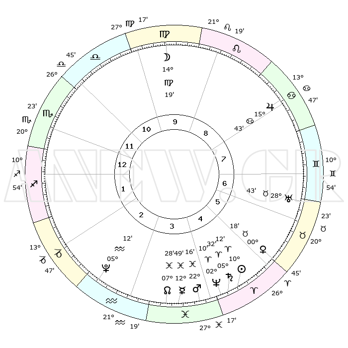 | | ΘΕΣΕΙΣ ΠΛΑΝΗΤΩΝ ΑΣΤΡΟΛΟΓΙΚΟΥ ΧΑΡΤΗ ΤΗΣ ΣΤΙΓΜΗΣ ΑΥΤΗΣ | | | | Πλανήτης | Ζώδιο | Μοίρες | Δεκαήμ. | Σε οίκο | Απόκλιση | | Ακμές των οίκων | | Ηλιος | Κριός | 10°08' | Δεύτερο | 5 | 04 N 01 | | 1ος | 22°07' | Σκορπιός | | Σελήνη | Παρθένος | 13°29' | Δεύτερο | 10 | 06 N 06 | | 2ος | 22°17' | Τοξότης | | Ερμής | Ιχθείς | 12°46' | Δεύτερο | 4 | 07 S 48 | | 3ος | 26°44' | Αιγόκερως | | Αφροδίτη | Ταύρος | 00°14' | Πρώτο | 5 | 11 N 05 | | 4ος | 02°28' | Ιχθείς | | Αρης | Ιχθείς | 22°13' | Τρίτο | 4 | 04 S 03 | | 5ος | 04°21' | Κριός | | Δίας | Καρκίνος | 15°42' | Δεύτερο | 8 | 22 N 53 | | 6ος | 00°28' | Ταύρος | | Κρόνος | Κριός | 05°31' | Πρώτο | 5 | 00 N 14 | | 7ος | 22°07' | Ταύρος | | Ουρανός | Ταύρος | 28°43' | Τρίτο | 7 | 19 N 42 | | 8ος | 22°17' | Δίδυμοι | | Ποσειδώνας | Κριός | 02°10' | Πρώτο | 4 | 00 S 20 | | 9ος | 26°44' | Καρκίνος | | Πλούτωνας | Υδροχόος | 05°12' | Πρώτο | 3 | 22 S 47 | | 10ος | 02°28' | Παρθένος | | Β. Δεσμός | Ιχθείς | 07°28' | Πρώτο | 4 | 08 S 46 | | 11ος | 04°21' | Ζυγός | | Ωροσκόπος | Σκορπιός | 22°07' | Τρίτο | | | 12ος | 00°28' | Σκορπιός | | Μεσουράνημα | Παρθένος | 02°28' | Πρώτο | | | |