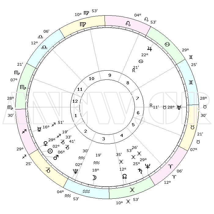 | | ΘΕΣΕΙΣ ΠΛΑΝΗΤΩΝ ΑΣΤΡΟΛΟΓΙΚΟΥ ΧΑΡΤΗ ΤΗΣ ΣΤΙΓΜΗΣ ΑΥΤΗΣ | | | | Πλανήτης | Ζώδιο | Μοίρες | Δεκαήμ. | Σε οίκο | Απόκλιση | | Ακμές των οίκων | | Ηλιος | Αιγόκερως | 02°28' | Πρώτο | 2 | 23 S 25 | | 1ος | 04°44' | Σκορπιός | | Σελήνη | Υδροχόος | 17°17' | Δεύτερο | 4 | 17 S 37 | | 2ος | 03°27' | Τοξότης | | Ερμής | Τοξότης | 16°44' | Δεύτερο | 2 | 22 S 24 | | 3ος | 05°49' | Αιγόκερως | | Αφροδίτη | Τοξότης | 29°12' | Τρίτο | 2 | 23 S 38 | | 4ος | 10°20' | Υδροχόος | | Αρης | Αιγόκερως | 06°37' | Πρώτο | 3 | 24 S 06 | | 5ος | 13°10' | Ιχθείς | | Δίας | Καρκίνος | 22°21'R | Τρίτο | 9 | 21 N 48 | | 6ος | 11°23' | Κριός | | Κρόνος | Ιχθείς | 25°52' | Τρίτο | 5 | 03 S 44 | | 7ος | 04°44' | Ταύρος | | Ουρανός | Ταύρος | 28°11'R | Τρίτο | 7 | 19 N 33 | | 8ος | 03°27' | Δίδυμοι | | Ποσειδώνας | Ιχθείς | 29°26' | Τρίτο | 5 | 01 S 27 | | 9ος | 05°49' | Καρκίνος | | Πλούτωνας | Υδροχόος | 02°29' | Πρώτο | 3 | 23 S 16 | | 10ος | 10°20' | Λέων | | Β. Δεσμός | Ιχθείς | 12°35' | Δεύτερο | 4 | 06 S 50 | | 11ος | 13°10' | Παρθένος | | Ωροσκόπος | Σκορπιός | 04°44' | Πρώτο | | | 12ος | 11°23' | Ζυγός | | Μεσουράνημα | Λέων | 10°20' | Δεύτερο | | | |