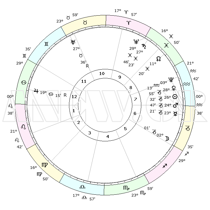 | | ΘΕΣΕΙΣ ΠΛΑΝΗΤΩΝ ΑΣΤΡΟΛΟΓΙΚΟΥ ΧΑΡΤΗ ΤΗΣ ΣΤΙΓΜΗΣ ΑΥΤΗΣ | | | | Πλανήτης | Ζώδιο | Μοίρες | Δεκαήμ. | Σε οίκο | Απόκλιση | | Ακμές των οίκων | | Ηλιος | Αιγόκερως | 26°27' | Τρίτο | 7 | 20 S 51 | | 1ος | 07°48' | Καρκίνος | | Σελήνη | Αιγόκερως | 01°06' | Πρώτο | 6 | 28 S 13 | | 2ος | 28°17' | Καρκίνος | | Ερμής | Αιγόκερως | 23°13' | Τρίτο | 7 | 23 S 17 | | 3ος | 20°41' | Λέων | | Αφροδίτη | Αιγόκερως | 28°49' | Τρίτο | 8 | 21 S 24 | | 4ος | 18°17' | Παρθένος | | Αρης | Αιγόκερως | 24°43' | Τρίτο | 7 | 22 S 08 | | 5ος | 23°19' | Ζυγός | | Δίας | Καρκίνος | 19°16'R | Δεύτερο | 1 | 22 N 19 | | 6ος | 02°33' | Τοξότης | | Κρόνος | Ιχθείς | 27°22' | Τρίτο | 10 | 03 S 05 | | 7ος | 07°48' | Αιγόκερως | | Ουρανός | Ταύρος | 27°36'R | Τρίτο | 11 | 19 N 26 | | 8ος | 28°16' | Αιγόκερως | | Ποσειδώνας | Ιχθείς | 29°46' | Τρίτο | 10 | 01 S 18 | | 9ος | 20°41' | Υδροχόος | | Πλούτωνας | Υδροχόος | 03°12' | Πρώτο | 8 | 23 S 07 | | 10ος | 18°17' | Ιχθείς | | Β. Δεσμός | Ιχθείς | 11°21' | Δεύτερο | 9 | 07 S 18 | | 11ος | 23°19' | Κριός | | Ωροσκόπος | Καρκίνος | 07°48' | Πρώτο | | | 12ος | 02°33' | Δίδυμοι | | Μεσουράνημα | Ιχθείς | 18°17' | Δεύτερο | | | |