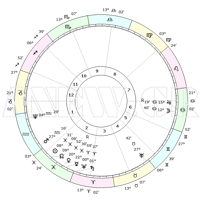 | | ΘΕΣΕΙΣ ΠΛΑΝΗΤΩΝ ΑΣΤΡΟΛΟΓΙΚΟΥ ΧΑΡΤΗ ΤΗΣ ΣΤΙΓΜΗΣ ΑΥΤΗΣ | | | | Πλανήτης | Ζώδιο | Μοίρες | Δεκαήμ. | Σε οίκο | Απόκλιση | | Ακμές των οίκων | | Ηλιος | Ιχθείς | 08°27' | Πρώτο | 2 | 08 S 24 | | 1ος | 25°48' | Τοξότης | | Σελήνη | Καρκίνος | 11°39' | Δεύτερο | 7 | 27 N 21 | | 2ος | 01°54' | Υδροχόος | | Ερμής | Ιχθείς | 22°31'R | Τρίτο | 3 | 00 S 16 | | 3ος | 11°33' | Ιχθείς | | Αφροδίτη | Ιχθείς | 20°47' | Τρίτο | 3 | 04 S 56 | | 4ος | 16°07' | Κριός | | Αρης | Υδροχόος | 27°13' | Τρίτο | 2 | 13 S 28 | | 5ος | 13°07' | Ταύρος | | Δίας | Καρκίνος | 15°19'R | Δεύτερο | 7 | 22 N 54 | | 6ος | 05°13' | Δίδυμοι | | Κρόνος | Κριός | 01°36' | Πρώτο | 3 | 01 S 19 | | 7ος | 25°48' | Δίδυμοι | | Ουρανός | Ταύρος | 27°41' | Τρίτο | 5 | 19 N 28 | | 8ος | 01°54' | Λέων | | Ποσειδώνας | Κριός | 00°59' | Πρώτο | 3 | 00 S 49 | | 9ος | 11°33' | Παρθένος | | Πλούτωνας | Υδροχόος | 04°29' | Πρώτο | 2 | 22 S 53 | | 10ος | 16°07' | Ζυγός | | Β. Δεσμός | Ιχθείς | 09°09' | Πρώτο | 2 | 08 S 08 | | 11ος | 13°07' | Σκορπιός | | Ωροσκόπος | Τοξότης | 25°48' | Τρίτο | | | 12ος | 05°13' | Τοξότης | | Μεσουράνημα | Ζυγός | 16°07' | Δεύτερο | | | |