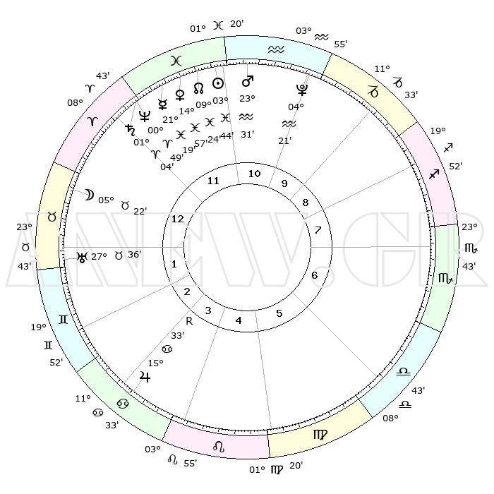 | | ΘΕΣΕΙΣ ΠΛΑΝΗΤΩΝ ΑΣΤΡΟΛΟΓΙΚΟΥ ΧΑΡΤΗ ΤΗΣ ΣΤΙΓΜΗΣ ΑΥΤΗΣ | | | | Πλανήτης | Ζώδιο | Μοίρες | Δεκαήμ. | Σε οίκο | Απόκλιση | | Ακμές των οίκων | | Ηλιος | Ιχθείς | 03°40' | Πρώτο | 12 | 10 S 10 | | 1ος | 16°52' | Κριός | | Σελήνη | Ταύρος | 04°21' | Πρώτο | 1 | 17 N 04 | | 2ος | 22°44' | Ταύρος | | Ερμής | Ιχθείς | 21°16' | Τρίτο | 12 | 01 S 46 | | 3ος | 17°47' | Δίδυμοι | | Αφροδίτη | Ιχθείς | 14°51' | Δεύτερο | 12 | 07 S 17 | | 4ος | 09°34' | Καρκίνος | | Αρης | Υδροχόος | 23°28' | Τρίτο | 11 | 14 S 43 | | 5ος | 02°51' | Λέων | | Δίας | Καρκίνος | 15°33'R | Δεύτερο | 4 | 22 N 52 | | 6ος | 03°04' | Παρθένος | | Κρόνος | Κριός | 01°03' | Πρώτο | 12 | 01 S 33 | | 7ος | 16°52' | Ζυγός | | Ουρανός | Ταύρος | 27°36' | Τρίτο | 2 | 19 N 27 | | 8ος | 22°44' | Σκορπιός | | Ποσειδώνας | Κριός | 00°49' | Πρώτο | 12 | 00 S 53 | | 9ος | 17°47' | Τοξότης | | Πλούτωνας | Υδροχόος | 04°21' | Πρώτο | 11 | 22 S 54 | | 10ος | 09°34' | Αιγόκερως | | Β. Δεσμός | Ιχθείς | 09°24' | Πρώτο | 12 | 08 S 03 | | 11ος | 02°51' | Υδροχόος | | Ωροσκόπος | Κριός | 16°52' | Δεύτερο | | | 12ος | 03°04' | Ιχθείς | | Μεσουράνημα | Αιγόκερως | 09°34' | Πρώτο | | | |
