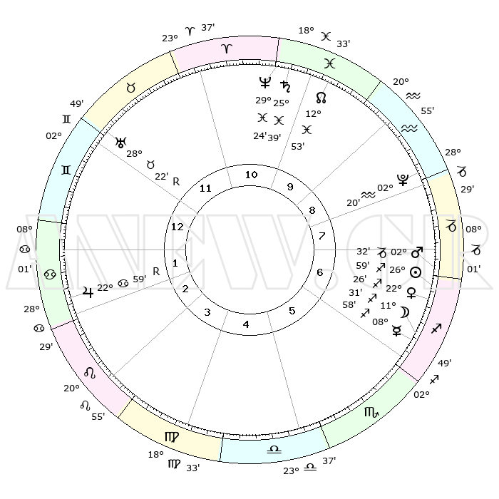 | | ΘΕΣΕΙΣ ΠΛΑΝΗΤΩΝ ΑΣΤΡΟΛΟΓΙΚΟΥ ΧΑΡΤΗ ΤΗΣ ΣΤΙΓΜΗΣ ΑΥΤΗΣ | | | | Πλανήτης | Ζώδιο | Μοίρες | Δεκαήμ. | Σε οίκο | Απόκλιση | | Ακμές των οίκων | | Ηλιος | Τοξότης | 26°32' | Τρίτο | 1 | 23 S 23 | | 1ος | 22°53' | Τοξότης | | Σελήνη | Τοξότης | 06°18' | Πρώτο | 12 | 26 S 15 | | 2ος | 28°17' | Αιγόκερως | | Ερμής | Τοξότης | 08°21' | Πρώτο | 12 | 20 S 35 | | 3ος | 07°36' | Ιχθείς | | Αφροδίτη | Τοξότης | 21°53' | Τρίτο | 12 | 23 S 09 | | 4ος | 12°33' | Κριός | | Αρης | Αιγόκερως | 02°12' | Πρώτο | 1 | 24 S 13 | | 5ος | 10°02' | Ταύρος | | Δίας | Καρκίνος | 23°01'R | Τρίτο | 7 | 21 N 40 | | 6ος | 02°23' | Δίδυμοι | | Κρόνος | Ιχθείς | 25°38' | Τρίτο | 3 | 03 S 51 | | 7ος | 22°53' | Δίδυμοι | | Ουρανός | Ταύρος | 28°23'R | Τρίτο | 5 | 19 N 36 | | 8ος | 28°17' | Καρκίνος | | Ποσειδώνας | Ιχθείς | 29°23' | Τρίτο | 3 | 01 S 28 | | 9ος | 07°36' | Παρθένος | | Πλούτωνας | Υδροχόος | 02°20' | Πρώτο | 2 | 23 S 18 | | 10ος | 12°33' | Ζυγός | | Β. Δεσμός | Ιχθείς | 12°54' | Δεύτερο | 3 | 06 S 43 | | 11ος | 10°02' | Σκορπιός | | Ωροσκόπος | Τοξότης | 22°53' | Τρίτο | | | 12ος | 02°23' | Τοξότης | | Μεσουράνημα | Ζυγός | 12°33' | Δεύτερο | | | |