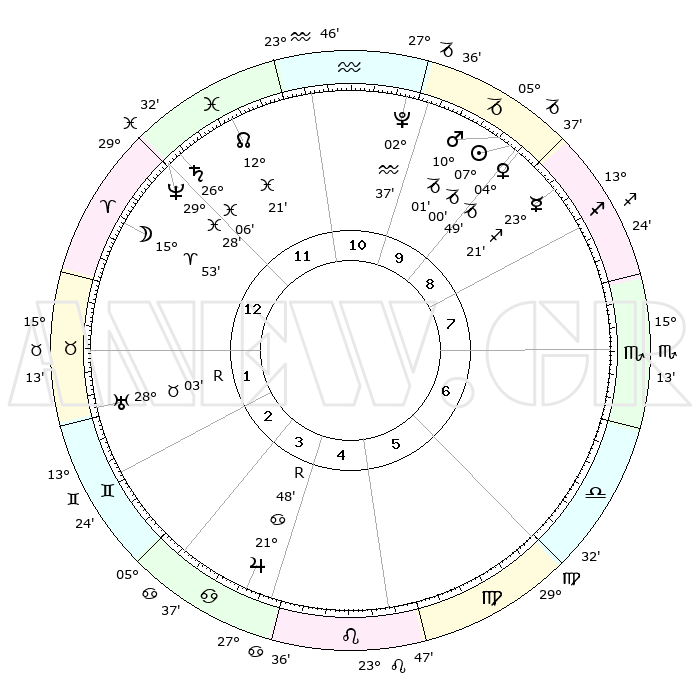 | | ΘΕΣΕΙΣ ΠΛΑΝΗΤΩΝ ΑΣΤΡΟΛΟΓΙΚΟΥ ΧΑΡΤΗ ΤΗΣ ΣΤΙΓΜΗΣ ΑΥΤΗΣ | | | | Πλανήτης | Ζώδιο | Μοίρες | Δεκαήμ. | Σε οίκο | Απόκλιση | | Ακμές των οίκων | | Ηλιος | Αιγόκερως | 06°55' | Πρώτο | 10 | 23 S 15 | | 1ος | 01°47' | Κριός | | Σελήνη | Κριός | 14°47' | Δεύτερο | 1 | 08 N 25 | | 2ος | 11°38' | Ταύρος | | Ερμής | Τοξότης | 23°14' | Τρίτο | 9 | 23 S 25 | | 3ος | 08°46' | Δίδυμοι | | Αφροδίτη | Αιγόκερως | 04°43' | Πρώτο | 10 | 23 S 43 | | 4ος | 01°00' | Καρκίνος | | Αρης | Αιγόκερως | 09°57' | Πρώτο | 10 | 23 S 56 | | 5ος | 23°23' | Καρκίνος | | Δίας | Καρκίνος | 21°49'R | Τρίτο | 4 | 21 N 54 | | 6ος | 21°04' | Λέων | | Κρόνος | Ιχθείς | 26°05' | Τρίτο | 12 | 03 S 38 | | 7ος | 01°47' | Ζυγός | | Ουρανός | Ταύρος | 28°03'R | Τρίτο | 2 | 19 N 32 | | 8ος | 11°38' | Σκορπιός | | Ποσειδώνας | Ιχθείς | 29°28' | Τρίτο | 12 | 01 S 26 | | 9ος | 08°46' | Τοξότης | | Πλούτωνας | Υδροχόος | 02°37' | Πρώτο | 11 | 23 S 15 | | 10ος | 01°00' | Αιγόκερως | | Β. Δεσμός | Ιχθείς | 12°22' | Δεύτερο | 12 | 06 S 55 | | 11ος | 23°23' | Αιγόκερως | | Ωροσκόπος | Κριός | 01°47' | Πρώτο | | | 12ος | 21°04' | Υδροχόος | | Μεσουράνημα | Αιγόκερως | 01°00' | Πρώτο | | | |