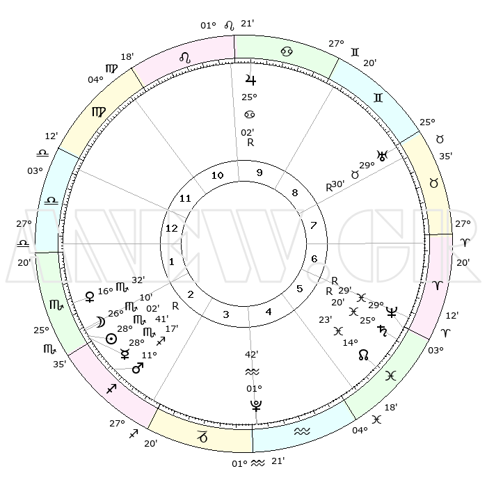 | | ΘΕΣΕΙΣ ΠΛΑΝΗΤΩΝ ΑΣΤΡΟΛΟΓΙΚΟΥ ΧΑΡΤΗ ΤΗΣ ΣΤΙΓΜΗΣ ΑΥΤΗΣ | | | | Πλανήτης | Ζώδιο | Μοίρες | Δεκαήμ. | Σε οίκο | Απόκλιση | | Ακμές των οίκων | | Ηλιος | Σκορπιός | 27°58' | Τρίτο | 2 | 19 S 42 | | 1ος | 08°36' | Ζυγός | | Σελήνη | Σκορπιός | 25°25' | Τρίτο | 2 | 23 S 41 | | 2ος | 05°46' | Σκορπιός | | Ερμής | Σκορπιός | 28°46'R | Τρίτο | 2 | 19 S 28 | | 3ος | 06°32' | Τοξότης | | Αφροδίτη | Σκορπιός | 16°27' | Δεύτερο | 2 | 15 S 44 | | 4ος | 09°40' | Αιγόκερως | | Αρης | Τοξότης | 11°14' | Δεύτερο | 3 | 22 S 41 | | 5ος | 12°36' | Υδροχόος | | Δίας | Καρκίνος | 25°02'R | Τρίτο | 10 | 21 N 15 | | 6ος | 12°41' | Ιχθείς | | Κρόνος | Ιχθείς | 25°20'R | Τρίτο | 6 | 04 S 04 | | 7ος | 08°36' | Κριός | | Ουρανός | Ταύρος | 29°30'R | Τρίτο | 8 | 19 N 50 | | 8ος | 05°46' | Ταύρος | | Ποσειδώνας | Ιχθείς | 29°29'R | Τρίτο | 6 | 01 S 27 | | 9ος | 06°32' | Δίδυμοι | | Πλούτωνας | Υδροχόος | 01°42' | Πρώτο | 4 | 23 S 27 | | 10ος | 09°40' | Καρκίνος | | Β. Δεσμός | Ιχθείς | 14°23' | Δεύτερο | 6 | 06 S 09 | | 11ος | 12°36' | Λέων | | Ωροσκόπος | Ζυγός | 08°36' | Πρώτο | | | 12ος | 12°41' | Παρθένος | | Μεσουράνημα | Καρκίνος | 09°40' | Πρώτο | | | |