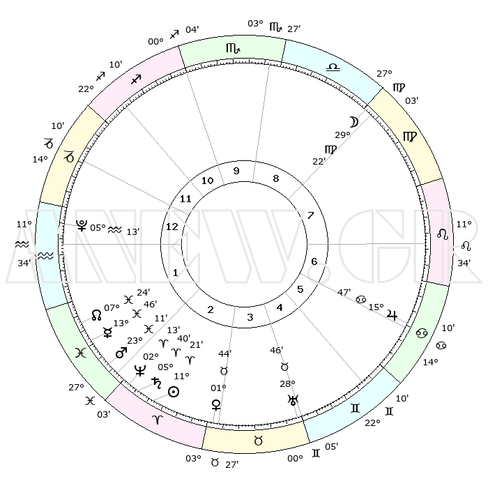 | | ΘΕΣΕΙΣ ΠΛΑΝΗΤΩΝ ΑΣΤΡΟΛΟΓΙΚΟΥ ΧΑΡΤΗ ΤΗΣ ΣΤΙΓΜΗΣ ΑΥΤΗΣ | | | | Πλανήτης | Ζώδιο | Μοίρες | Δεκαήμ. | Σε οίκο | Απόκλιση | | Ακμές των οίκων | | Ηλιος | Κριός | 11°17' | Δεύτερο | 3 | 04 N 28 | | 1ος | 14°37' | Αιγόκερως | | Σελήνη | Παρθένος | 28°32' | Τρίτο | 8 | 01 S 02 | | 2ος | 25°29' | Υδροχόος | | Ερμής | Ιχθείς | 13°42' | Δεύτερο | 2 | 07 S 37 | | 3ος | 05°37' | Κριός | | Αφροδίτη | Ταύρος | 01°39' | Πρώτο | 3 | 11 N 38 | | 4ος | 06°55' | Ταύρος | | Αρης | Ιχθείς | 23°08' | Τρίτο | 2 | 03 S 41 | | 5ος | 01°10' | Δίδυμοι | | Δίας | Καρκίνος | 15°47' | Δεύτερο | 7 | 22 N 52 | | 6ος | 22°24' | Δίδυμοι | | Κρόνος | Κριός | 05°40' | Πρώτο | 3 | 00 N 18 | | 7ος | 14°37' | Καρκίνος | | Ουρανός | Ταύρος | 28°46' | Τρίτο | 4 | 19 N 43 | | 8ος | 25°29' | Λέων | | Ποσειδώνας | Κριός | 02°13' | Πρώτο | 2 | 00 S 19 | | 9ος | 05°37' | Ζυγός | | Πλούτωνας | Υδροχόος | 05°13' | Πρώτο | 1 | 22 S 47 | | 10ος | 06°55' | Σκορπιός | | Β. Δεσμός | Ιχθείς | 07°24' | Πρώτο | 2 | 08 S 47 | | 11ος | 01°10' | Τοξότης | | Ωροσκόπος | Αιγόκερως | 14°37' | Δεύτερο | | | 12ος | 22°24' | Τοξότης | | Μεσουράνημα | Σκορπιός | 06°55' | Πρώτο | | | |