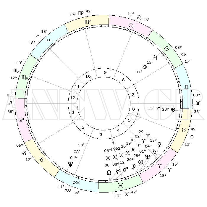 | | ΘΕΣΕΙΣ ΠΛΑΝΗΤΩΝ ΑΣΤΡΟΛΟΓΙΚΟΥ ΧΑΡΤΗ ΤΗΣ ΣΤΙΓΜΗΣ ΑΥΤΗΣ | | | | Πλανήτης | Ζώδιο | Μοίρες | Δεκαήμ. | Σε οίκο | Απόκλιση | | Ακμές των οίκων | | Ηλιος | Ιχθείς | 28°14' | Τρίτο | 5 | 00 S 42 | | 1ος | 12°13' | Σκορπιός | | Σελήνη | Ιχθείς | 25°24' | Τρίτο | 5 | 00 S 27 | | 2ος | 11°28' | Τοξότης | | Ερμής | Ιχθείς | 08°41'R | Πρώτο | 4 | 06 S 57 | | 3ος | 14°37' | Αιγόκερως | | Αφροδίτη | Κριός | 15°24' | Δεύτερο | 5 | 05 N 12 | | 4ος | 19°42' | Υδροχόος | | Αρης | Ιχθείς | 12°48' | Δεύτερο | 4 | 07 S 45 | | 5ος | 22°16' | Ιχθείς | | Δίας | Καρκίνος | 15°11' | Δεύτερο | 9 | 22 N 56 | | 6ος | 19°39' | Κριός | | Κρόνος | Κριός | 04°01' | Πρώτο | 5 | 00 S 21 | | 7ος | 12°14' | Ταύρος | | Ουρανός | Ταύρος | 28°15' | Τρίτο | 7 | 19 N 36 | | 8ος | 11°28' | Δίδυμοι | | Ποσειδώνας | Κριός | 01°43' | Πρώτο | 5 | 00 S 31 | | 9ος | 14°37' | Καρκίνος | | Πλούτωνας | Υδροχόος | 04°58' | Πρώτο | 3 | 22 S 49 | | 10ος | 19°42' | Λέων | | Β. Δεσμός | Ιχθείς | 08°06' | Πρώτο | 4 | 08 S 32 | | 11ος | 22°16' | Παρθένος | | Ωροσκόπος | Σκορπιός | 12°13' | Δεύτερο | | | 12ος | 19°39' | Ζυγός | | Μεσουράνημα | Λέων | 19°42' | Δεύτερο | | | |