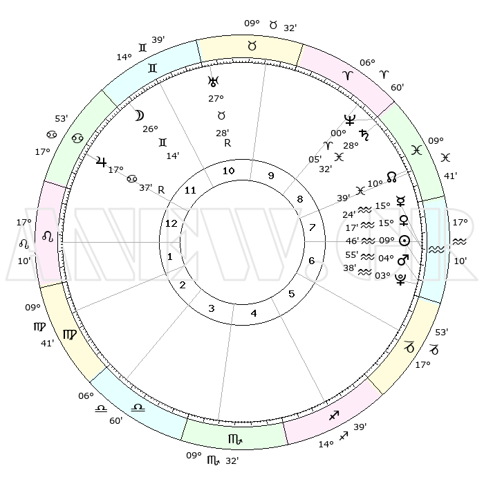 | | ΘΕΣΕΙΣ ΠΛΑΝΗΤΩΝ ΑΣΤΡΟΛΟΓΙΚΟΥ ΧΑΡΤΗ ΤΗΣ ΣΤΙΓΜΗΣ ΑΥΤΗΣ | | | | Πλανήτης | Ζώδιο | Μοίρες | Δεκαήμ. | Σε οίκο | Απόκλιση | | Ακμές των οίκων | | Ηλιος | Υδροχόος | 09°42' | Πρώτο | 7 | 17 S 49 | | 1ος | 28°13' | Καρκίνος | | Σελήνη | Δίδυμοι | 25°17' | Τρίτο | 11 | 28 N 21 | | 2ος | 19°08' | Λέων | | Ερμής | Υδροχόος | 15°17' | Δεύτερο | 7 | 18 S 09 | | 3ος | 13°56' | Παρθένος | | Αφροδίτη | Υδροχόος | 15°12' | Δεύτερο | 7 | 17 S 32 | | 4ος | 14°45' | Ζυγός | | Αρης | Υδροχόος | 04°52' | Πρώτο | 7 | 20 S 03 | | 5ος | 20°49' | Σκορπιός | | Δίας | Καρκίνος | 17°38'R | Δεύτερο | 12 | 22 N 34 | | 6ος | 26°50' | Τοξότης | | Κρόνος | Ιχθείς | 28°31' | Τρίτο | 9 | 02 S 35 | | 7ος | 28°13' | Αιγόκερως | | Ουρανός | Ταύρος | 27°28'R | Τρίτο | 11 | 19 N 24 | | 8ος | 19°08' | Υδροχόος | | Ποσειδώνας | Κριός | 00°05' | Πρώτο | 9 | 01 S 11 | | 9ος | 13°56' | Ιχθείς | | Πλούτωνας | Υδροχόος | 03°38' | Πρώτο | 7 | 23 S 02 | | 10ος | 14°45' | Κριός | | Β. Δεσμός | Ιχθείς | 10°39' | Δεύτερο | 8 | 07 S 34 | | 11ος | 20°49' | Ταύρος | | Ωροσκόπος | Καρκίνος | 28°13' | Τρίτο | | | 12ος | 26°50' | Δίδυμοι | | Μεσουράνημα | Κριός | 14°45' | Δεύτερο | | | |