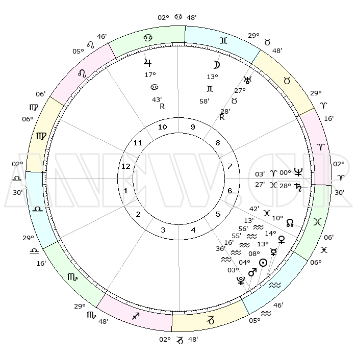 | | ΘΕΣΕΙΣ ΠΛΑΝΗΤΩΝ ΑΣΤΡΟΛΟΓΙΚΟΥ ΧΑΡΤΗ ΤΗΣ ΣΤΙΓΜΗΣ ΑΥΤΗΣ | | | | Πλανήτης | Ζώδιο | Μοίρες | Δεκαήμ. | Σε οίκο | Απόκλιση | | Ακμές των οίκων | | Ηλιος | Υδροχόος | 08°51' | Πρώτο | 5 | 18 S 03 | | 1ος | 12°03' | Παρθένος | | Σελήνη | Δίδυμοι | 12°57' | Δεύτερο | 10 | 27 N 30 | | 2ος | 07°07' | Ζυγός | | Ερμής | Υδροχόος | 13°48' | Δεύτερο | 5 | 18 S 37 | | 3ος | 06°42' | Σκορπιός | | Αφροδίτη | Υδροχόος | 14°08' | Δεύτερο | 5 | 17 S 50 | | 4ος | 09°39' | Τοξότης | | Αρης | Υδροχόος | 04°13' | Πρώτο | 5 | 20 S 12 | | 5ος | 13°09' | Αιγόκερως | | Δίας | Καρκίνος | 17°44'R | Δεύτερο | 11 | 22 N 33 | | 6ος | 14°20' | Υδροχόος | | Κρόνος | Ιχθείς | 28°27' | Τρίτο | 7 | 02 S 37 | | 7ος | 12°03' | Ιχθείς | | Ουρανός | Ταύρος | 27°28'R | Τρίτο | 9 | 19 N 24 | | 8ος | 07°07' | Κριός | | Ποσειδώνας | Κριός | 00°03' | Πρώτο | 7 | 01 S 11 | | 9ος | 06°42' | Ταύρος | | Πλούτωνας | Υδροχόος | 03°36' | Πρώτο | 5 | 23 S 02 | | 10ος | 09°39' | Δίδυμοι | | Β. Δεσμός | Ιχθείς | 10°42' | Δεύτερο | 6 | 07 S 33 | | 11ος | 13°09' | Καρκίνος | | Ωροσκόπος | Παρθένος | 12°03' | Δεύτερο | | | 12ος | 14°20' | Λέων | | Μεσουράνημα | Δίδυμοι | 09°39' | Πρώτο | | | |