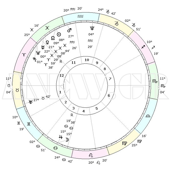 | | ΘΕΣΕΙΣ ΠΛΑΝΗΤΩΝ ΑΣΤΡΟΛΟΓΙΚΟΥ ΧΑΡΤΗ ΤΗΣ ΣΤΙΓΜΗΣ ΑΥΤΗΣ | | | | Πλανήτης | Ζώδιο | Μοίρες | Δεκαήμ. | Σε οίκο | Απόκλιση | | Ακμές των οίκων | | Ηλιος | Ιχθείς | 08°40' | Πρώτο | 12 | 08 S 19 | | 1ος | 06°13' | Κριός | | Σελήνη | Καρκίνος | 14°44' | Δεύτερο | 4 | 26 N 53 | | 2ος | 14°57' | Ταύρος | | Ερμής | Ιχθείς | 22°29'R | Τρίτο | 12 | 00 S 14 | | 3ος | 11°26' | Δίδυμοι | | Αφροδίτη | Ιχθείς | 21°03' | Τρίτο | 12 | 04 S 49 | | 4ος | 03°30' | Καρκίνος | | Αρης | Υδροχόος | 27°23' | Τρίτο | 12 | 13 S 24 | | 5ος | 26°06' | Καρκίνος | | Δίας | Καρκίνος | 15°19'R | Δεύτερο | 4 | 22 N 54 | | 6ος | 24°30' | Λέων | | Κρόνος | Κριός | 01°38' | Πρώτο | 12 | 01 S 19 | | 7ος | 06°13' | Ζυγός | | Ουρανός | Ταύρος | 27°42' | Τρίτο | 2 | 19 N 28 | | 8ος | 14°57' | Σκορπιός | | Ποσειδώνας | Κριός | 00°59' | Πρώτο | 12 | 00 S 48 | | 9ος | 11°26' | Τοξότης | | Πλούτωνας | Υδροχόος | 04°29' | Πρώτο | 11 | 22 S 53 | | 10ος | 03°30' | Αιγόκερως | | Β. Δεσμός | Ιχθείς | 09°08' | Πρώτο | 12 | 08 S 09 | | 11ος | 26°06' | Αιγόκερως | | Ωροσκόπος | Κριός | 06°13' | Πρώτο | | | 12ος | 24°30' | Υδροχόος | | Μεσουράνημα | Αιγόκερως | 03°30' | Πρώτο | | | |