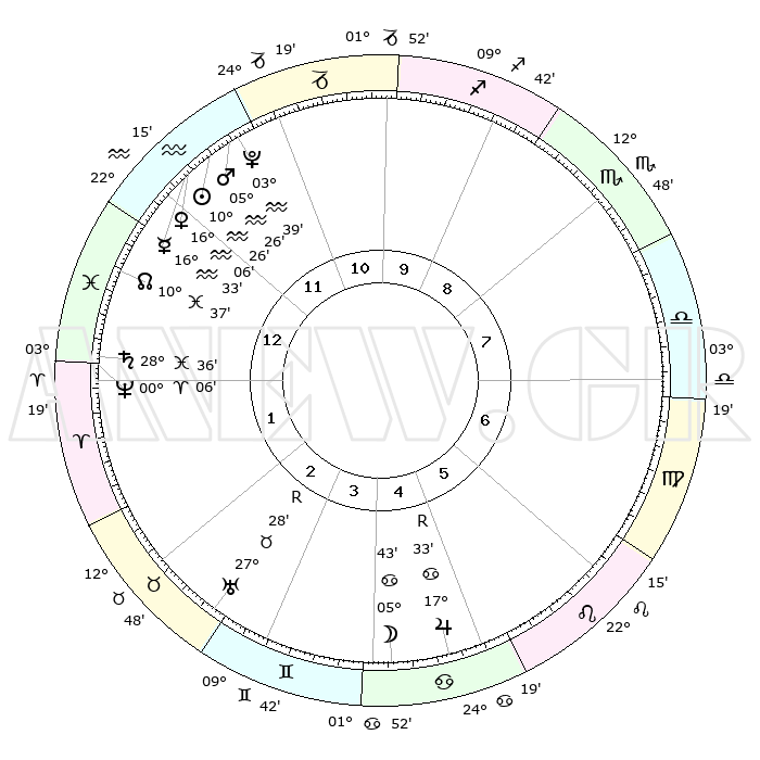 | | ΘΕΣΕΙΣ ΠΛΑΝΗΤΩΝ ΑΣΤΡΟΛΟΓΙΚΟΥ ΧΑΡΤΗ ΤΗΣ ΣΤΙΓΜΗΣ ΑΥΤΗΣ | | | | Πλανήτης | Ζώδιο | Μοίρες | Δεκαήμ. | Σε οίκο | Απόκλιση | | Ακμές των οίκων | | Ηλιος | Υδροχόος | 10°22' | Δεύτερο | 12 | 17 S 38 | | 1ος | 27°60' | Υδροχόος | | Σελήνη | Καρκίνος | 04°49' | Πρώτο | 5 | 28 N 02 | | 2ος | 13°33' | Κριός | | Ερμής | Υδροχόος | 16°26' | Δεύτερο | 12 | 17 S 47 | | 3ος | 16°40' | Ταύρος | | Αφροδίτη | Υδροχόος | 16°01' | Δεύτερο | 12 | 17 S 18 | | 4ος | 11°16' | Δίδυμοι | | Αρης | Υδροχόος | 05°23' | Πρώτο | 12 | 19 S 55 | | 5ος | 02°58' | Καρκίνος | | Δίας | Καρκίνος | 17°33'R | Δεύτερο | 5 | 22 N 35 | | 6ος | 26°20' | Καρκίνος | | Κρόνος | Ιχθείς | 28°35' | Τρίτο | 1 | 02 S 34 | | 7ος | 27°60' | Λέων | | Ουρανός | Ταύρος | 27°28'R | Τρίτο | 3 | 19 N 24 | | 8ος | 13°33' | Ζυγός | | Ποσειδώνας | Κριός | 00°06' | Πρώτο | 1 | 01 S 10 | | 9ος | 16°40' | Σκορπιός | | Πλούτωνας | Υδροχόος | 03°39' | Πρώτο | 12 | 23 S 02 | | 10ος | 11°16' | Τοξότης | | Β. Δεσμός | Ιχθείς | 10°37' | Δεύτερο | 1 | 07 S 35 | | 11ος | 02°58' | Αιγόκερως | | Ωροσκόπος | Υδροχόος | 27°60' | Τρίτο | | | 12ος | 26°20' | Αιγόκερως | | Μεσουράνημα | Τοξότης | 11°16' | Δεύτερο | | | |