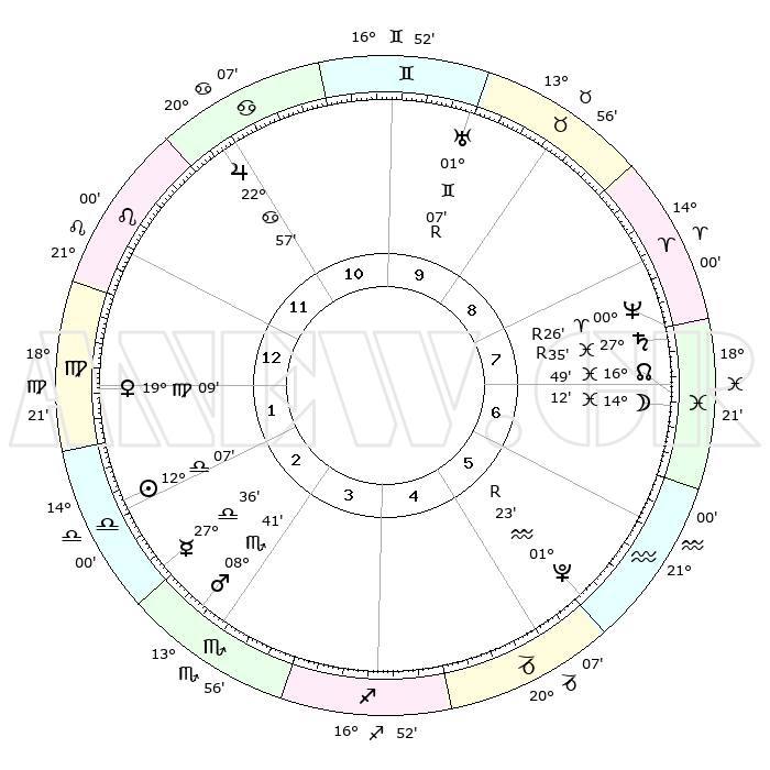 | ΘΕΣΕΙΣ ΠΛΑΝΗΤΩΝ ΑΣΤΡΟΛΟΓΙΚΟΥ ΧΑΡΤΗ ΤΗΣ ΣΤΙΓΜΗΣ ΑΥΤΗΣ | | Πλανήτης | Ζώδιο | Μοίρες | Δεκαήμ. | Σε οίκο | Απόκλιση | | Ακμές των οίκων | Ηλιος | Ζυγός | 12°01' | Δεύτερο | 3 | 04 S 45 | | 1ος | 17°10' | Λέων | Σελήνη | Ιχθείς | 12°42' | Δεύτερο | 8 | 07 S 16 | | 2ος | 09°41' | Παρθένος | Ερμής | Ζυγός | 27°26' | Τρίτο | 3 | 11 S 06 | | 3ος | 06°60' | Ζυγός | Αφροδίτη | Παρθένος | 19°01' | Δεύτερο | 2 | 05 N 37 | | 4ος | 09°32' | Σκορπιός | Αρης | Σκορπιός | 08°36' | Πρώτο | 3 | 14 S 29 | | 5ος | 14°39' | Τοξότης | Δίας | Καρκίνος | 22°56' | Τρίτο | 12 | 21 N 31 | | 6ος | 17°52' | Αιγόκερως | Κρόνος | Ιχθείς | 27°35'R | Τρίτο | 8 | 03 S 16 | | 7ος | 17°10' | Υδροχόος | Ουρανός | Δίδυμοι | 01°07'R | Πρώτο | 10 | 20 N 10 | | 8ος | 09°41' | Ιχθείς | Ποσειδώνας | Κριός | 00°26'R | Πρώτο | 8 | 01 S 05 | | 9ος | 06°60' | Κριός | Πλούτωνας | Υδροχόος | 01°23'R | Πρώτο | 6 | 23 S 32 | | 10ος | 09°32' | Ταύρος | Β. Δεσμός | Ιχθείς | 16°50' | Δεύτερο | 8 | 05 S 12 | | 11ος | 14°39' | Δίδυμοι | Ωροσκόπος | Λέων | 17°10' | Δεύτερο | | | 12ος | 17°52' | Καρκίνος | Μεσουράνημα | Ταύρος | 09°32' | Πρώτο | | | |