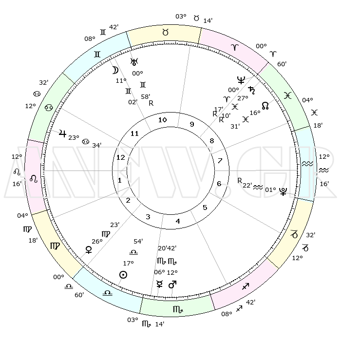 | ΘΕΣΕΙΣ ΠΛΑΝΗΤΩΝ ΑΣΤΡΟΛΟΓΙΚΟΥ ΧΑΡΤΗ ΤΗΣ ΣΤΙΓΜΗΣ ΑΥΤΗΣ | | Πλανήτης | Ζώδιο | Μοίρες | Δεκαήμ. | Σε οίκο | Απόκλιση | | Ακμές των οίκων | Ηλιος | Ζυγός | 17°44' | Δεύτερο | 5 | 06 S 58 | | 1ος | 21°35' | Δίδυμοι | Σελήνη | Δίδυμοι | 08°37' | Πρώτο | 12 | 26 N 49 | | 2ος | 13°03' | Καρκίνος | Ερμής | Σκορπιός | 06°05' | Πρώτο | 5 | 14 S 44 | | 3ος | 04°26' | Λέων | Αφροδίτη | Παρθένος | 26°11' | Τρίτο | 4 | 02 N 52 | | 4ος | 29°29' | Λέων | Αρης | Σκορπιός | 12°36' | Δεύτερο | 6 | 15 S 47 | | 5ος | 01°58' | Ζυγός | Δίας | Καρκίνος | 23°33' | Τρίτο | 2 | 21 N 25 | | 6ος | 12°16' | Σκορπιός | Κρόνος | Ιχθείς | 27°10'R | Τρίτο | 10 | 03 S 25 | | 7ος | 21°34' | Τοξότης | Ουρανός | Δίδυμοι | 00°58'R | Πρώτο | 12 | 20 N 09 | | 8ος | 13°03' | Αιγόκερως | Ποσειδώνας | Κριός | 00°17'R | Πρώτο | 10 | 01 S 09 | | 9ος | 04°26' | Υδροχόος | Πλούτωνας | Υδροχόος | 01°22'R | Πρώτο | 8 | 23 S 32 | | 10ος | 29°29' | Υδροχόος | Β. Δεσμός | Ιχθείς | 16°31' | Δεύτερο | 10 | 05 S 19 | | 11ος | 01°58' | Κριός | Ωροσκόπος | Δίδυμοι | 21°35' | Τρίτο | | | 12ος | 12°16' | Ταύρος | Μεσουράνημα | Υδροχόος | 29°29' | Τρίτο | | | |