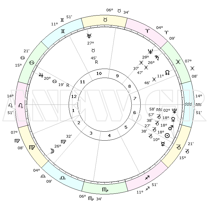 | | ΘΕΣΕΙΣ ΠΛΑΝΗΤΩΝ ΑΣΤΡΟΛΟΓΙΚΟΥ ΧΑΡΤΗ ΤΗΣ ΣΤΙΓΜΗΣ ΑΥΤΗΣ | | | | Πλανήτης | Ζώδιο | Μοίρες | Δεκαήμ. | Σε οίκο | Απόκλιση | | Ακμές των οίκων | | Ηλιος | Αιγόκερως | 16°52' | Δεύτερο | 1 | 22 S 22 | | 1ος | 26°35' | Τοξότης | | Σελήνη | Παρθένος | 06°24' | Πρώτο | 8 | 09 N 29 | | 2ος | 02°53' | Υδροχόος | | Ερμής | Αιγόκερως | 08°12' | Πρώτο | 1 | 24 S 22 | | 3ος | 12°35' | Ιχθείς | | Αφροδίτη | Αιγόκερως | 16°60' | Δεύτερο | 1 | 23 S 04 | | 4ος | 17°03' | Κριός | | Αρης | Αιγόκερως | 17°27' | Δεύτερο | 1 | 23 S 13 | | 5ος | 13°55' | Ταύρος | | Δίας | Καρκίνος | 20°32'R | Τρίτο | 7 | 22 N 07 | | 6ος | 05°58' | Δίδυμοι | | Κρόνος | Ιχθείς | 26°41' | Τρίτο | 3 | 03 S 23 | | 7ος | 26°35' | Δίδυμοι | | Ουρανός | Ταύρος | 27°47'R | Τρίτο | 5 | 19 N 28 | | 8ος | 02°53' | Λέων | | Ποσειδώνας | Ιχθείς | 29°36' | Τρίτο | 3 | 01 S 23 | | 9ος | 12°35' | Παρθένος | | Πλούτωνας | Υδροχόος | 02°55' | Πρώτο | 2 | 23 S 11 | | 10ος | 17°03' | Ζυγός | | Β. Δεσμός | Ιχθείς | 11°51' | Δεύτερο | 2 | 07 S 07 | | 11ος | 13°55' | Σκορπιός | | Ωροσκόπος | Τοξότης | 26°35' | Τρίτο | | | 12ος | 05°58' | Τοξότης | | Μεσουράνημα | Ζυγός | 17°03' | Δεύτερο | | | |