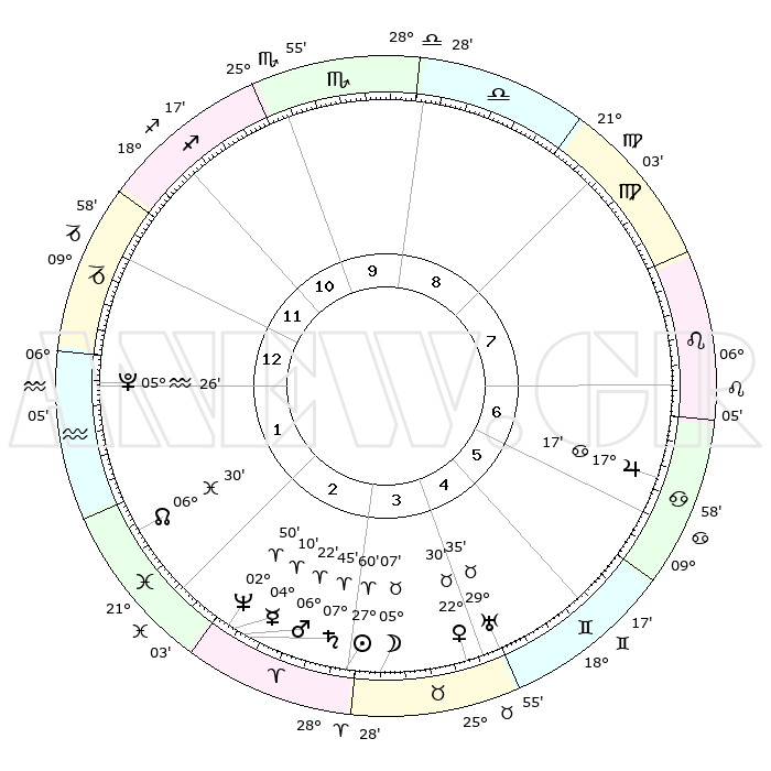 | | ΘΕΣΕΙΣ ΠΛΑΝΗΤΩΝ ΑΣΤΡΟΛΟΓΙΚΟΥ ΧΑΡΤΗ ΤΗΣ ΣΤΙΓΜΗΣ ΑΥΤΗΣ | | | | Πλανήτης | Ζώδιο | Μοίρες | Δεκαήμ. | Σε οίκο | Απόκλιση | | Ακμές των οίκων | | Ηλιος | Κριός | 27°56' | Τρίτο | 3 | 10 N 44 | | 1ος | 13°33' | Αιγόκερως | | Σελήνη | Ταύρος | 04°17' | Πρώτο | 3 | 16 N 57 | | 2ος | 24°09' | Υδροχόος | | Ερμής | Κριός | 04°05' | Πρώτο | 2 | 00 S 48 | | 3ος | 04°20' | Κριός | | Αφροδίτη | Ταύρος | 22°26' | Τρίτο | 4 | 18 N 40 | | 4ος | 05°51' | Ταύρος | | Αρης | Κριός | 06°20' | Πρώτο | 3 | 01 N 38 | | 5ος | 00°14' | Δίδυμοι | | Δίας | Καρκίνος | 17°17' | Δεύτερο | 7 | 22 N 42 | | 6ος | 21°29' | Δίδυμοι | | Κρόνος | Κριός | 07°44' | Πρώτο | 3 | 01 N 06 | | 7ος | 13°33' | Καρκίνος | | Ουρανός | Ταύρος | 29°35' | Τρίτο | 4 | 19 N 53 | | 8ος | 24°09' | Λέων | | Ποσειδώνας | Κριός | 02°50' | Πρώτο | 2 | 00 S 05 | | 9ος | 04°20' | Ζυγός | | Πλούτωνας | Υδροχόος | 05°26' | Πρώτο | 1 | 22 S 47 | | 10ος | 05°51' | Σκορπιός | | Β. Δεσμός | Ιχθείς | 06°30' | Πρώτο | 2 | 09 S 07 | | 11ος | 00°14' | Τοξότης | | Ωροσκόπος | Αιγόκερως | 13°33' | Δεύτερο | | | 12ος | 21°29' | Τοξότης | | Μεσουράνημα | Σκορπιός | 05°51' | Πρώτο | | | |