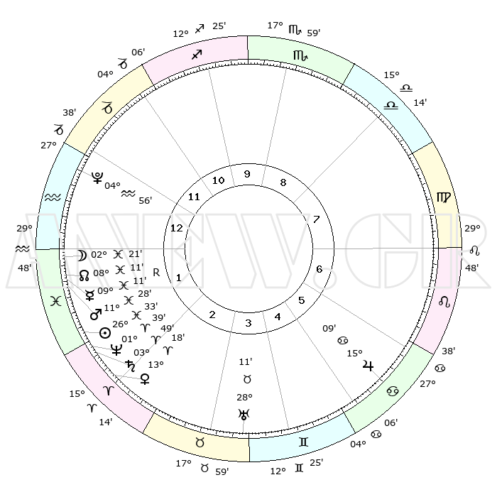 | | ΘΕΣΕΙΣ ΠΛΑΝΗΤΩΝ ΑΣΤΡΟΛΟΓΙΚΟΥ ΧΑΡΤΗ ΤΗΣ ΣΤΙΓΜΗΣ ΑΥΤΗΣ | | | | Πλανήτης | Ζώδιο | Μοίρες | Δεκαήμ. | Σε οίκο | Απόκλιση | | Ακμές των οίκων | | Ηλιος | Ιχθείς | 26°29' | Τρίτο | 2 | 01 S 24 | | 1ος | 28°18' | Αιγόκερως | | Σελήνη | Ιχθείς | 01°28' | Πρώτο | 1 | 11 S 36 | | 2ος | 12°06' | Ιχθείς | | Ερμής | Ιχθείς | 09°12'R | Πρώτο | 1 | 06 S 21 | | 3ος | 20°49' | Κριός | | Αφροδίτη | Κριός | 13°13' | Δεύτερο | 2 | 04 N 19 | | 4ος | 19°34' | Ταύρος | | Αρης | Ιχθείς | 11°25' | Δεύτερο | 1 | 08 S 17 | | 5ος | 12°28' | Δίδυμοι | | Δίας | Καρκίνος | 15°09' | Δεύτερο | 6 | 22 N 56 | | 6ος | 03°50' | Καρκίνος | | Κρόνος | Κριός | 03°48' | Πρώτο | 2 | 00 S 26 | | 7ος | 28°18' | Καρκίνος | | Ουρανός | Ταύρος | 28°11' | Τρίτο | 4 | 19 N 35 | | 8ος | 12°06' | Παρθένος | | Ποσειδώνας | Κριός | 01°39' | Πρώτο | 2 | 00 S 33 | | 9ος | 20°49' | Ζυγός | | Πλούτωνας | Υδροχόος | 04°56' | Πρώτο | 1 | 22 S 49 | | 10ος | 19°34' | Σκορπιός | | Β. Δεσμός | Ιχθείς | 08°12' | Πρώτο | 1 | 08 S 30 | | 11ος | 12°28' | Τοξότης | | Ωροσκόπος | Αιγόκερως | 28°18' | Τρίτο | | | 12ος | 03°50' | Αιγόκερως | | Μεσουράνημα | Σκορπιός | 19°34' | Δεύτερο | | | |