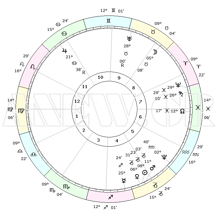| | ΘΕΣΕΙΣ ΠΛΑΝΗΤΩΝ ΑΣΤΡΟΛΟΓΙΚΟΥ ΧΑΡΤΗ ΤΗΣ ΣΤΙΓΜΗΣ ΑΥΤΗΣ | | | | Πλανήτης | Ζώδιο | Μοίρες | Δεκαήμ. | Σε οίκο | Απόκλιση | | Ακμές των οίκων | | Ηλιος | Αιγόκερως | 08°18' | Πρώτο | 5 | 23 S 10 | | 1ος | 19°24' | Λέων | | Σελήνη | Ταύρος | 03°55' | Πρώτο | 9 | 16 N 37 | | 2ος | 12°09' | Παρθένος | | Ερμής | Τοξότης | 25°17' | Τρίτο | 5 | 23 S 40 | | 3ος | 09°43' | Ζυγός | | Αφροδίτη | Αιγόκερως | 06°25' | Πρώτο | 5 | 23 S 42 | | 4ος | 12°22' | Σκορπιός | | Αρης | Αιγόκερως | 10°59' | Δεύτερο | 5 | 23 S 51 | | 5ος | 17°19' | Τοξότης | | Δίας | Καρκίνος | 21°39'R | Τρίτο | 12 | 21 N 55 | | 6ος | 20°17' | Αιγόκερως | | Κρόνος | Ιχθείς | 26°10' | Τρίτο | 8 | 03 S 36 | | 7ος | 19°24' | Υδροχόος | | Ουρανός | Ταύρος | 28°00'R | Τρίτο | 10 | 19 N 31 | | 8ος | 12°09' | Ιχθείς | | Ποσειδώνας | Ιχθείς | 29°29' | Τρίτο | 8 | 01 S 26 | | 9ος | 09°43' | Κριός | | Πλούτωνας | Υδροχόος | 02°39' | Πρώτο | 6 | 23 S 14 | | 10ος | 12°22' | Ταύρος | | Β. Δεσμός | Ιχθείς | 12°17' | Δεύτερο | 8 | 06 S 57 | | 11ος | 17°20' | Δίδυμοι | | Ωροσκόπος | Λέων | 19°24' | Δεύτερο | | | 12ος | 20°17' | Καρκίνος | | Μεσουράνημα | Ταύρος | 12°22' | Δεύτερο | | | |