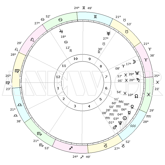 | | ΘΕΣΕΙΣ ΠΛΑΝΗΤΩΝ ΑΣΤΡΟΛΟΓΙΚΟΥ ΧΑΡΤΗ ΤΗΣ ΣΤΙΓΜΗΣ ΑΥΤΗΣ | | | | Πλανήτης | Ζώδιο | Μοίρες | Δεκαήμ. | Σε οίκο | Απόκλιση | | Ακμές των οίκων | | Ηλιος | Υδροχόος | 04°45' | Πρώτο | 6 | 19 S 04 | | 1ος | 02°21' | Παρθένος | | Σελήνη | Κριός | 16°04' | Δεύτερο | 8 | 09 N 12 | | 2ος | 26°27' | Παρθένος | | Ερμής | Υδροχόος | 06°52' | Πρώτο | 6 | 20 S 34 | | 3ος | 25°20' | Ζυγός | | Αφροδίτη | Υδροχόος | 09°05' | Πρώτο | 6 | 19 S 10 | | 4ος | 28°16' | Σκορπιός | | Αρης | Υδροχόος | 01°04' | Πρώτο | 5 | 20 S 54 | | 5ος | 02°18' | Αιγόκερως | | Δίας | Καρκίνος | 18°13'R | Δεύτερο | 11 | 22 N 29 | | 6ος | 04°05' | Υδροχόος | | Κρόνος | Ιχθείς | 28°04' | Τρίτο | 8 | 02 S 47 | | 7ος | 02°21' | Ιχθείς | | Ουρανός | Ταύρος | 27°30'R | Τρίτο | 9 | 19 N 25 | | 8ος | 26°27' | Ιχθείς | | Ποσειδώνας | Ιχθείς | 29°57' | Τρίτο | 8 | 01 S 14 | | 9ος | 25°20' | Κριός | | Πλούτωνας | Υδροχόος | 03°28' | Πρώτο | 5 | 23 S 04 | | 10ος | 28°16' | Ταύρος | | Β. Δεσμός | Ιχθείς | 10°55' | Δεύτερο | 7 | 07 S 28 | | 11ος | 02°18' | Καρκίνος | | Ωροσκόπος | Παρθένος | 02°21' | Πρώτο | | | 12ος | 04°05' | Λέων | | Μεσουράνημα | Ταύρος | 28°16' | Τρίτο | | | |