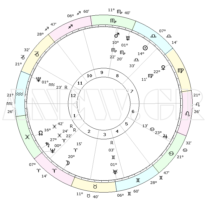 | ΘΕΣΕΙΣ ΠΛΑΝΗΤΩΝ ΑΣΤΡΟΛΟΓΙΚΟΥ ΧΑΡΤΗ ΤΗΣ ΣΤΙΓΜΗΣ ΑΥΤΗΣ | | Πλανήτης | Ζώδιο | Μοίρες | Δεκαήμ. | Σε οίκο | Απόκλιση | | Ακμές των οίκων | Ηλιος | Ζυγός | 14°28' | Δεύτερο | 9 | 05 S 42 | | 1ος | 13°20' | Αιγόκερως | Σελήνη | Κριός | 18°56' | Δεύτερο | 3 | 09 N 53 | | 2ος | 23°53' | Υδροχόος | Ερμής | Σκορπιός | 01°12' | Πρώτο | 9 | 12 S 43 | | 3ος | 04°05' | Κριός | Αφροδίτη | Παρθένος | 22°05' | Τρίτο | 8 | 04 N 27 | | 4ος | 05°38' | Ταύρος | Αρης | Σκορπιός | 10°18' | Δεύτερο | 10 | 15 S 03 | | 5ος | 00°02' | Δίδυμοι | Δίας | Καρκίνος | 23°12' | Τρίτο | 7 | 21 N 28 | | 6ος | 21°18' | Δίδυμοι | Κρόνος | Ιχθείς | 27°24'R | Τρίτο | 2 | 03 S 20 | | 7ος | 13°20' | Καρκίνος | Ουρανός | Δίδυμοι | 01°04'R | Πρώτο | 5 | 20 N 10 | | 8ος | 23°53' | Λέων | Ποσειδώνας | Κριός | 00°22'R | Πρώτο | 2 | 01 S 07 | | 9ος | 04°05' | Ζυγός | Πλούτωνας | Υδροχόος | 01°23'R | Πρώτο | 1 | 23 S 32 | | 10ος | 05°38' | Σκορπιός | Β. Δεσμός | Ιχθείς | 16°42' | Δεύτερο | 2 | 05 S 15 | | 11ος | 00°02' | Τοξότης | Ωροσκόπος | Αιγόκερως | 13°20' | Δεύτερο | | | 12ος | 21°18' | Τοξότης | Μεσουράνημα | Σκορπιός | 05°38' | Πρώτο | | | |