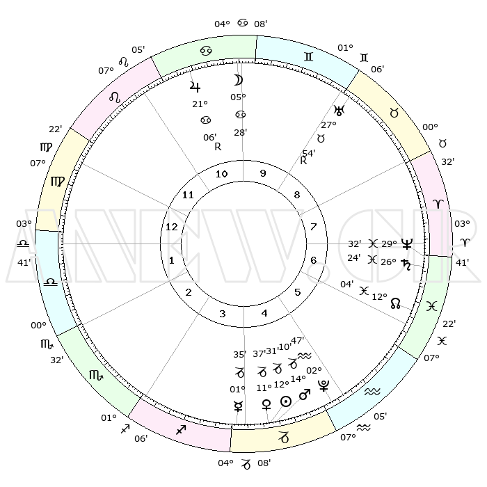 | | ΘΕΣΕΙΣ ΠΛΑΝΗΤΩΝ ΑΣΤΡΟΛΟΓΙΚΟΥ ΧΑΡΤΗ ΤΗΣ ΣΤΙΓΜΗΣ ΑΥΤΗΣ | | | | Πλανήτης | Ζώδιο | Μοίρες | Δεκαήμ. | Σε οίκο | Απόκλιση | | Ακμές των οίκων | | Ηλιος | Αιγόκερως | 12°26' | Δεύτερο | 5 | 22 S 51 | | 1ος | 10°35' | Παρθένος | | Σελήνη | Καρκίνος | 04°17' | Πρώτο | 10 | 28 N 00 | | 2ος | 05°30' | Ζυγός | | Ερμής | Αιγόκερως | 01°28' | Πρώτο | 4 | 24 S 12 | | 3ος | 04°60' | Σκορπιός | | Αφροδίτη | Αιγόκερως | 11°32' | Δεύτερο | 5 | 23 S 30 | | 4ος | 07°57' | Τοξότης | | Αρης | Αιγόκερως | 14°06' | Δεύτερο | 5 | 23 S 35 | | 5ος | 11°31' | Αιγόκερως | | Δίας | Καρκίνος | 21°07'R | Τρίτο | 11 | 22 N 01 | | 6ος | 12°46' | Υδροχόος | | Κρόνος | Ιχθείς | 26°24' | Τρίτο | 7 | 03 S 30 | | 7ος | 10°35' | Ιχθείς | | Ουρανός | Ταύρος | 27°54'R | Τρίτο | 9 | 19 N 30 | | 8ος | 05°30' | Κριός | | Ποσειδώνας | Ιχθείς | 29°32' | Τρίτο | 7 | 01 S 24 | | 9ος | 04°60' | Ταύρος | | Πλούτωνας | Υδροχόος | 02°47' | Πρώτο | 5 | 23 S 12 | | 10ος | 07°57' | Δίδυμοι | | Β. Δεσμός | Ιχθείς | 12°04' | Δεύτερο | 7 | 07 S 02 | | 11ος | 11°31' | Καρκίνος | | Ωροσκόπος | Παρθένος | 10°35' | Δεύτερο | | | 12ος | 12°46' | Λέων | | Μεσουράνημα | Δίδυμοι | 07°57' | Πρώτο | | | |