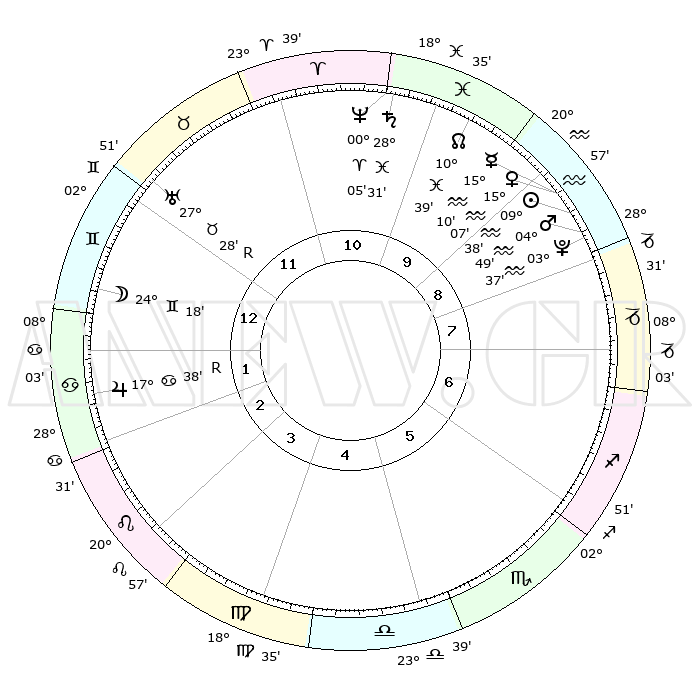| | ΘΕΣΕΙΣ ΠΛΑΝΗΤΩΝ ΑΣΤΡΟΛΟΓΙΚΟΥ ΧΑΡΤΗ ΤΗΣ ΣΤΙΓΜΗΣ ΑΥΤΗΣ | | | | Πλανήτης | Ζώδιο | Μοίρες | Δεκαήμ. | Σε οίκο | Απόκλιση | | Ακμές των οίκων | | Ηλιος | Υδροχόος | 09°35' | Πρώτο | 9 | 17 S 51 | | 1ος | 18°13' | Δίδυμοι | | Σελήνη | Δίδυμοι | 23°27' | Τρίτο | 1 | 28 N 19 | | 2ος | 10°04' | Καρκίνος | | Ερμής | Υδροχόος | 15°04' | Δεύτερο | 9 | 18 S 14 | | 3ος | 01°21' | Λέων | | Αφροδίτη | Υδροχόος | 15°02' | Δεύτερο | 9 | 17 S 35 | | 4ος | 25°57' | Λέων | | Αρης | Υδροχόος | 04°46' | Πρώτο | 9 | 20 S 04 | | 5ος | 27°48' | Παρθένος | | Δίας | Καρκίνος | 17°38'R | Δεύτερο | 2 | 22 N 34 | | 6ος | 08°03' | Σκορπιός | | Κρόνος | Ιχθείς | 28°31' | Τρίτο | 11 | 02 S 36 | | 7ος | 18°13' | Τοξότης | | Ουρανός | Ταύρος | 27°28'R | Τρίτο | 12 | 19 N 24 | | 8ος | 10°04' | Αιγόκερως | | Ποσειδώνας | Κριός | 00°05' | Πρώτο | 11 | 01 S 11 | | 9ος | 01°21' | Υδροχόος | | Πλούτωνας | Υδροχόος | 03°37' | Πρώτο | 9 | 23 S 02 | | 10ος | 25°57' | Υδροχόος | | Β. Δεσμός | Ιχθείς | 10°40' | Δεύτερο | 10 | 07 S 34 | | 11ος | 27°48' | Ιχθείς | | Ωροσκόπος | Δίδυμοι | 18°13' | Δεύτερο | | | 12ος | 08°03' | Ταύρος | | Μεσουράνημα | Υδροχόος | 25°57' | Τρίτο | | | |
