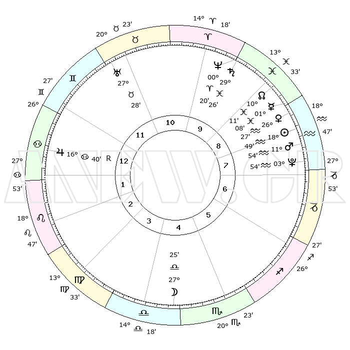 | | ΘΕΣΕΙΣ ΠΛΑΝΗΤΩΝ ΑΣΤΡΟΛΟΓΙΚΟΥ ΧΑΡΤΗ ΤΗΣ ΣΤΙΓΜΗΣ ΑΥΤΗΣ | | | | Πλανήτης | Ζώδιο | Μοίρες | Δεκαήμ. | Σε οίκο | Απόκλιση | | Ακμές των οίκων | | Ηλιος | Υδροχόος | 18°45' | Δεύτερο | 8 | 15 S 12 | | 1ος | 10°44' | Καρκίνος | | Σελήνη | Ζυγός | 26°44' | Τρίτο | 4 | 13 S 55 | | 2ος | 01°10' | Λέων | | Ερμής | Ιχθείς | 01°02' | Πρώτο | 9 | 12 S 17 | | 3ος | 23°52' | Λέων | | Αφροδίτη | Υδροχόος | 26°23' | Τρίτο | 9 | 14 S 04 | | 4ος | 21°58' | Παρθένος | | Αρης | Υδροχόος | 11°51' | Δεύτερο | 8 | 18 S 15 | | 5ος | 27°19' | Ζυγός | | Δίας | Καρκίνος | 16°40'R | Δεύτερο | 1 | 22 N 42 | | 6ος | 06°09' | Τοξότης | | Κρόνος | Ιχθείς | 29°25' | Τρίτο | 10 | 02 S 13 | | 7ος | 10°44' | Αιγόκερως | | Ουρανός | Ταύρος | 27°28' | Τρίτο | 11 | 19 N 24 | | 8ος | 01°10' | Υδροχόος | | Ποσειδώνας | Κριός | 00°20' | Πρώτο | 10 | 01 S 04 | | 9ος | 23°52' | Υδροχόος | | Πλούτωνας | Υδροχόος | 03°54' | Πρώτο | 8 | 22 S 59 | | 10ος | 21°58' | Ιχθείς | | Β. Δεσμός | Ιχθείς | 10°11' | Δεύτερο | 9 | 07 S 45 | | 11ος | 27°19' | Κριός | | Ωροσκόπος | Καρκίνος | 10°44' | Δεύτερο | | | 12ος | 06°09' | Δίδυμοι | | Μεσουράνημα | Ιχθείς | 21°58' | Τρίτο | | | |