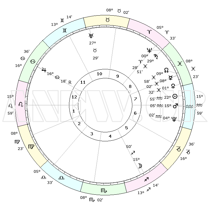 | | ΘΕΣΕΙΣ ΠΛΑΝΗΤΩΝ ΑΣΤΡΟΛΟΓΙΚΟΥ ΧΑΡΤΗ ΤΗΣ ΣΤΙΓΜΗΣ ΑΥΤΗΣ | | | | Πλανήτης | Ζώδιο | Μοίρες | Δεκαήμ. | Σε οίκο | Απόκλιση | | Ακμές των οίκων | | Ηλιος | Υδροχόος | 22°51' | Τρίτο | 8 | 13 S 54 | | 1ος | 26°11' | Καρκίνος | | Σελήνη | Τοξότης | 15°01' | Δεύτερο | 5 | 27 S 47 | | 2ος | 16°60' | Λέων | | Ερμής | Ιχθείς | 07°55' | Πρώτο | 8 | 09 S 11 | | 3ος | 11°32' | Παρθένος | | Αφροδίτη | Ιχθείς | 01°26' | Πρώτο | 8 | 12 S 19 | | 4ος | 12°04' | Ζυγός | | Αρης | Υδροχόος | 15°02' | Δεύτερο | 7 | 17 S 21 | | 5ος | 18°10' | Σκορπιός | | Δίας | Καρκίνος | 16°18'R | Δεύτερο | 12 | 22 N 45 | | 6ος | 24°30' | Τοξότης | | Κρόνος | Ιχθείς | 29°51' | Τρίτο | 9 | 02 S 02 | | 7ος | 26°11' | Αιγόκερως | | Ουρανός | Ταύρος | 27°29' | Τρίτο | 11 | 19 N 25 | | 8ος | 16°60' | Υδροχόος | | Ποσειδώνας | Κριός | 00°27' | Πρώτο | 9 | 01 S 01 | | 9ος | 11°32' | Ιχθείς | | Πλούτωνας | Υδροχόος | 04°02' | Πρώτο | 7 | 22 S 58 | | 10ος | 12°04' | Κριός | | Β. Δεσμός | Ιχθείς | 09°58' | Πρώτο | 8 | 07 S 50 | | 11ος | 18°10' | Ταύρος | | Ωροσκόπος | Καρκίνος | 26°11' | Τρίτο | | | 12ος | 24°30' | Δίδυμοι | | Μεσουράνημα | Κριός | 12°04' | Δεύτερο | | | |