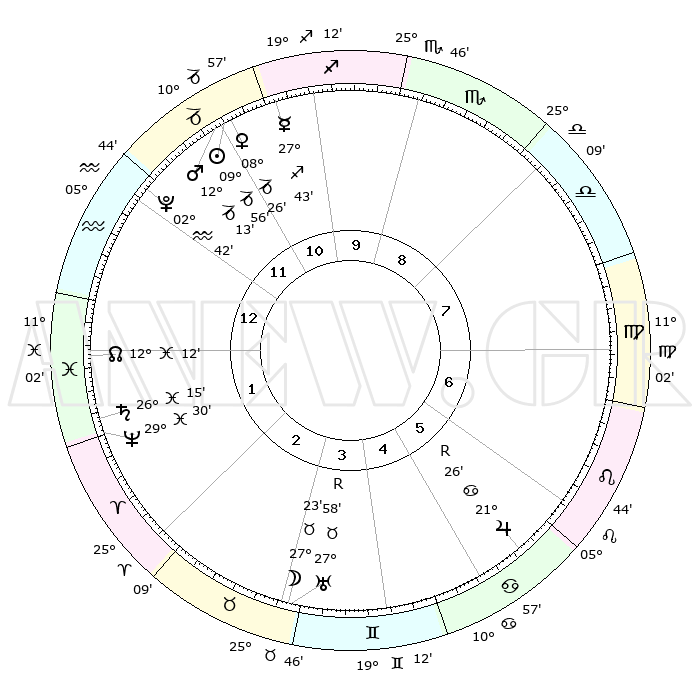 | | ΘΕΣΕΙΣ ΠΛΑΝΗΤΩΝ ΑΣΤΡΟΛΟΓΙΚΟΥ ΧΑΡΤΗ ΤΗΣ ΣΤΙΓΜΗΣ ΑΥΤΗΣ | | | | Πλανήτης | Ζώδιο | Μοίρες | Δεκαήμ. | Σε οίκο | Απόκλιση | | Ακμές των οίκων | | Ηλιος | Αιγόκερως | 09°51' | Πρώτο | 12 | 23 S 04 | | 1ος | 00°24' | Υδροχόος | | Σελήνη | Ταύρος | 26°10' | Τρίτο | 4 | 24 N 03 | | 2ος | 14°34' | Ιχθείς | | Ερμής | Τοξότης | 27°35' | Τρίτο | 11 | 23 S 54 | | 3ος | 22°57' | Κριός | | Αφροδίτη | Αιγόκερως | 08°20' | Πρώτο | 12 | 23 S 39 | | 4ος | 21°21' | Ταύρος | | Αρης | Αιγόκερως | 12°09' | Δεύτερο | 12 | 23 S 46 | | 5ος | 14°05' | Δίδυμοι | | Δίας | Καρκίνος | 21°27'R | Τρίτο | 6 | 21 N 58 | | 6ος | 05°31' | Καρκίνος | | Κρόνος | Ιχθείς | 26°15' | Τρίτο | 2 | 03 S 34 | | 7ος | 00°24' | Λέων | | Ουρανός | Ταύρος | 27°58'R | Τρίτο | 4 | 19 N 30 | | 8ος | 14°34' | Παρθένος | | Ποσειδώνας | Ιχθείς | 29°30' | Τρίτο | 2 | 01 S 25 | | 9ος | 22°57' | Ζυγός | | Πλούτωνας | Υδροχόος | 02°42' | Πρώτο | 1 | 23 S 13 | | 10ος | 21°21' | Σκορπιός | | Β. Δεσμός | Ιχθείς | 12°12' | Δεύτερο | 1 | 06 S 59 | | 11ος | 14°05' | Τοξότης | | Ωροσκόπος | Υδροχόος | 00°24' | Πρώτο | | | 12ος | 05°31' | Αιγόκερως | | Μεσουράνημα | Σκορπιός | 21°21' | Τρίτο | | | |