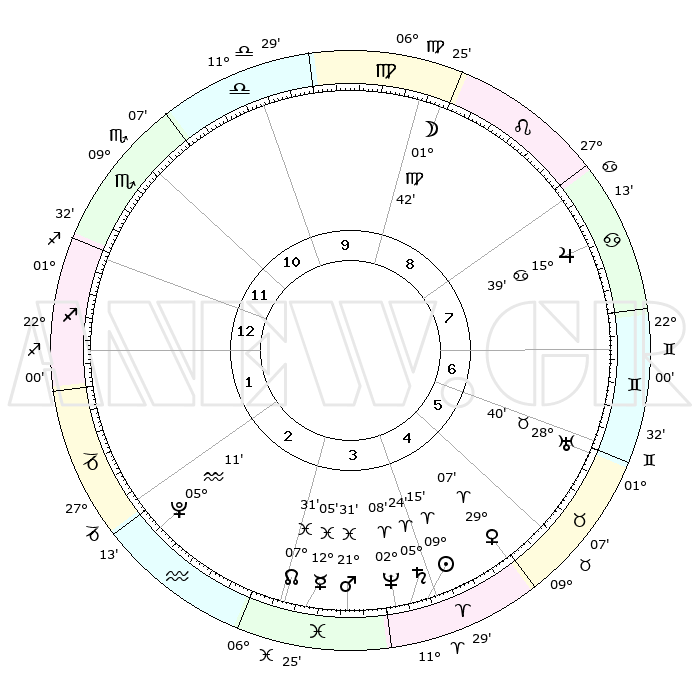 | | ΘΕΣΕΙΣ ΠΛΑΝΗΤΩΝ ΑΣΤΡΟΛΟΓΙΚΟΥ ΧΑΡΤΗ ΤΗΣ ΣΤΙΓΜΗΣ ΑΥΤΗΣ | | | | Πλανήτης | Ζώδιο | Μοίρες | Δεκαήμ. | Σε οίκο | Απόκλιση | | Ακμές των οίκων | | Ηλιος | Κριός | 09°11' | Πρώτο | 4 | 03 N 38 | | 1ος | 28°48' | Σκορπιός | | Σελήνη | Παρθένος | 00°40' | Πρώτο | 9 | 11 N 55 | | 2ος | 29°45' | Τοξότης | | Ερμής | Ιχθείς | 12°02' | Δεύτερο | 4 | 07 S 56 | | 3ος | 05°16' | Υδροχόος | | Αφροδίτη | Κριός | 29°01' | Τρίτο | 5 | 10 N 38 | | 4ος | 11°17' | Ιχθείς | | Αρης | Ιχθείς | 21°27' | Τρίτο | 4 | 04 S 21 | | 5ος | 12°28' | Κριός | | Δίας | Καρκίνος | 15°39' | Δεύτερο | 8 | 22 N 53 | | 6ος | 07°40' | Ταύρος | | Κρόνος | Κριός | 05°24' | Πρώτο | 4 | 00 N 11 | | 7ος | 28°48' | Ταύρος | | Ουρανός | Ταύρος | 28°40' | Τρίτο | 6 | 19 N 41 | | 8ος | 29°45' | Δίδυμοι | | Ποσειδώνας | Κριός | 02°08' | Πρώτο | 4 | 00 S 21 | | 9ος | 05°16' | Λέων | | Πλούτωνας | Υδροχόος | 05°11' | Πρώτο | 2 | 22 S 48 | | 10ος | 11°17' | Παρθένος | | Β. Δεσμός | Ιχθείς | 07°31' | Πρώτο | 3 | 08 S 45 | | 11ος | 12°28' | Ζυγός | | Ωροσκόπος | Σκορπιός | 28°48' | Τρίτο | | | 12ος | 07°40' | Σκορπιός | | Μεσουράνημα | Παρθένος | 11°17' | Δεύτερο | | | |