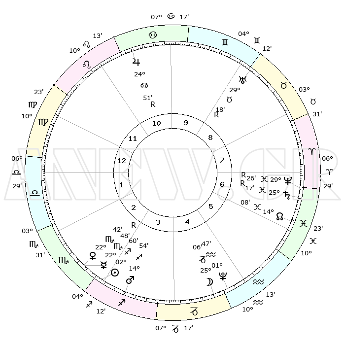 | | ΘΕΣΕΙΣ ΠΛΑΝΗΤΩΝ ΑΣΤΡΟΛΟΓΙΚΟΥ ΧΑΡΤΗ ΤΗΣ ΣΤΙΓΜΗΣ ΑΥΤΗΣ | | | | Πλανήτης | Ζώδιο | Μοίρες | Δεκαήμ. | Σε οίκο | Απόκλιση | | Ακμές των οίκων | | Ηλιος | Τοξότης | 02°54' | Πρώτο | 3 | 20 S 44 | | 1ος | 09°54' | Παρθένος | | Σελήνη | Αιγόκερως | 23°60' | Τρίτο | 5 | 25 S 07 | | 2ος | 04°46' | Ζυγός | | Ερμής | Σκορπιός | 22°53'R | Τρίτο | 3 | 16 S 41 | | 3ος | 04°12' | Σκορπιός | | Αφροδίτη | Σκορπιός | 22°35' | Τρίτο | 3 | 17 S 32 | | 4ος | 07°10' | Τοξότης | | Αρης | Τοξότης | 14°49' | Δεύτερο | 4 | 23 S 11 | | 5ος | 10°45' | Αιγόκερως | | Δίας | Καρκίνος | 24°51'R | Τρίτο | 11 | 21 N 18 | | 6ος | 12°03' | Υδροχόος | | Κρόνος | Ιχθείς | 25°17'R | Τρίτο | 7 | 04 S 04 | | 7ος | 09°54' | Ιχθείς | | Ουρανός | Ταύρος | 29°18'R | Τρίτο | 9 | 19 N 48 | | 8ος | 04°46' | Κριός | | Ποσειδώνας | Ιχθείς | 29°26'R | Τρίτο | 7 | 01 S 28 | | 9ος | 04°12' | Ταύρος | | Πλούτωνας | Υδροχόος | 01°47' | Πρώτο | 5 | 23 S 26 | | 10ος | 07°10' | Δίδυμοι | | Β. Δεσμός | Ιχθείς | 14°08' | Δεύτερο | 7 | 06 S 15 | | 11ος | 10°45' | Καρκίνος | | Ωροσκόπος | Παρθένος | 09°54' | Πρώτο | | | 12ος | 12°03' | Λέων | | Μεσουράνημα | Δίδυμοι | 07°10' | Πρώτο | | | |