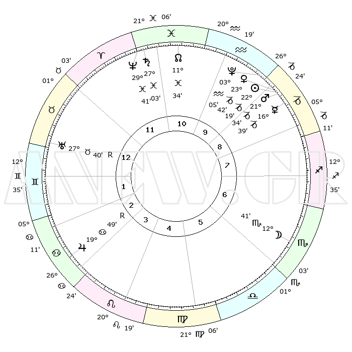 | | ΘΕΣΕΙΣ ΠΛΑΝΗΤΩΝ ΑΣΤΡΟΛΟΓΙΚΟΥ ΧΑΡΤΗ ΤΗΣ ΣΤΙΓΜΗΣ ΑΥΤΗΣ | | | | Πλανήτης | Ζώδιο | Μοίρες | Δεκαήμ. | Σε οίκο | Απόκλιση | | Ακμές των οίκων | | Ηλιος | Αιγόκερως | 22°11' | Τρίτο | 10 | 21 S 36 | | 1ος | 08°43' | Κριός | | Σελήνη | Σκορπιός | 11°07' | Δεύτερο | 7 | 19 S 25 | | 2ος | 16°48' | Ταύρος | | Ερμής | Αιγόκερως | 16°26' | Δεύτερο | 10 | 24 S 02 | | 3ος | 12°56' | Δίδυμοι | | Αφροδίτη | Αιγόκερως | 23°33' | Τρίτο | 10 | 22 S 16 | | 4ος | 04°54' | Καρκίνος | | Αρης | Αιγόκερως | 21°28' | Τρίτο | 10 | 22 S 40 | | 5ος | 27°39' | Καρκίνος | | Δίας | Καρκίνος | 19°50'R | Δεύτερο | 4 | 22 N 14 | | 6ος | 26°28' | Λέων | | Κρόνος | Ιχθείς | 27°03' | Τρίτο | 12 | 03 S 13 | | 7ος | 08°43' | Ζυγός | | Ουρανός | Ταύρος | 27°41'R | Τρίτο | 2 | 19 N 27 | | 8ος | 16°48' | Σκορπιός | | Ποσειδώνας | Ιχθείς | 29°41' | Τρίτο | 12 | 01 S 20 | | 9ος | 12°56' | Τοξότης | | Πλούτωνας | Υδροχόος | 03°04' | Πρώτο | 11 | 23 S 09 | | 10ος | 04°54' | Αιγόκερως | | Β. Δεσμός | Ιχθείς | 11°34' | Δεύτερο | 12 | 07 S 13 | | 11ος | 27°39' | Αιγόκερως | | Ωροσκόπος | Κριός | 08°43' | Πρώτο | | | 12ος | 26°28' | Υδροχόος | | Μεσουράνημα | Αιγόκερως | 04°54' | Πρώτο | | | |