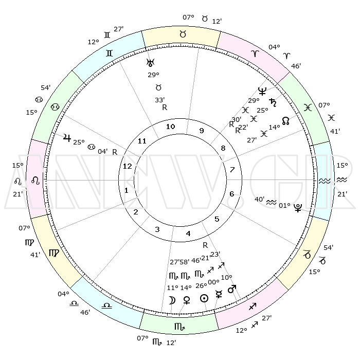 | | ΘΕΣΕΙΣ ΠΛΑΝΗΤΩΝ ΑΣΤΡΟΛΟΓΙΚΟΥ ΧΑΡΤΗ ΤΗΣ ΣΤΙΓΜΗΣ ΑΥΤΗΣ | | | | Πλανήτης | Ζώδιο | Μοίρες | Δεκαήμ. | Σε οίκο | Απόκλιση | | Ακμές των οίκων | | Ηλιος | Σκορπιός | 26°43' | Τρίτο | 5 | 19 S 25 | | 1ος | 26°58' | Καρκίνος | | Σελήνη | Σκορπιός | 10°42' | Δεύτερο | 4 | 18 S 56 | | 2ος | 17°49' | Λέων | | Ερμής | Τοξότης | 00°26'R | Πρώτο | 5 | 20 S 14 | | 3ος | 12°27' | Παρθένος | | Αφροδίτη | Σκορπιός | 14°53' | Δεύτερο | 4 | 15 S 15 | | 4ος | 13°06' | Ζυγός | | Αρης | Τοξότης | 10°20' | Δεύτερο | 5 | 22 S 33 | | 5ος | 19°11' | Σκορπιός | | Δίας | Καρκίνος | 25°04'R | Τρίτο | 12 | 21 N 14 | | 6ος | 25°24' | Τοξότης | | Κρόνος | Ιχθείς | 25°22'R | Τρίτο | 9 | 04 S 03 | | 7ος | 26°58' | Αιγόκερως | | Ουρανός | Ταύρος | 29°33'R | Τρίτο | 11 | 19 N 51 | | 8ος | 17°49' | Υδροχόος | | Ποσειδώνας | Ιχθείς | 29°30'R | Τρίτο | 9 | 01 S 27 | | 9ος | 12°27' | Ιχθείς | | Πλούτωνας | Υδροχόος | 01°40' | Πρώτο | 7 | 23 S 27 | | 10ος | 13°06' | Κριός | | Β. Δεσμός | Ιχθείς | 14°27' | Δεύτερο | 9 | 06 S 07 | | 11ος | 19°11' | Ταύρος | | Ωροσκόπος | Καρκίνος | 26°58' | Τρίτο | | | 12ος | 25°24' | Δίδυμοι | | Μεσουράνημα | Κριός | 13°06' | Δεύτερο | | | |