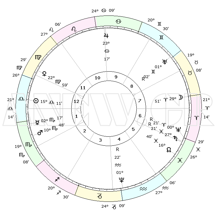 | ΘΕΣΕΙΣ ΠΛΑΝΗΤΩΝ ΑΣΤΡΟΛΟΓΙΚΟΥ ΧΑΡΤΗ ΤΗΣ ΣΤΙΓΜΗΣ ΑΥΤΗΣ | | Πλανήτης | Ζώδιο | Μοίρες | Δεκαήμ. | Σε οίκο | Απόκλιση | | Ακμές των οίκων | Ηλιος | Ζυγός | 15°04' | Δεύτερο | 1 | 05 S 56 | | 1ος | 19°20' | Παρθένος | Σελήνη | Κριός | 28°13' | Τρίτο | 8 | 13 N 59 | | 2ος | 15°04' | Ζυγός | Ερμής | Σκορπιός | 02°07' | Πρώτο | 2 | 13 S 06 | | 3ος | 15°03' | Σκορπιός | Αφροδίτη | Παρθένος | 22°51' | Τρίτο | 1 | 04 N 09 | | 4ος | 17°59' | Τοξότης | Αρης | Σκορπιός | 10°44' | Δεύτερο | 2 | 15 S 11 | | 5ος | 21°11' | Αιγόκερως | Δίας | Καρκίνος | 23°16' | Τρίτο | 11 | 21 N 28 | | 6ος | 22°02' | Υδροχόος | Κρόνος | Ιχθείς | 27°22'R | Τρίτο | 7 | 03 S 21 | | 7ος | 19°20' | Ιχθείς | Ουρανός | Δίδυμοι | 01°03'R | Πρώτο | 9 | 20 N 09 | | 8ος | 15°04' | Κριός | Ποσειδώνας | Κριός | 00°21'R | Πρώτο | 7 | 01 S 07 | | 9ος | 15°03' | Ταύρος | Πλούτωνας | Υδροχόος | 01°22'R | Πρώτο | 5 | 23 S 32 | | 10ος | 17°59' | Δίδυμοι | Β. Δεσμός | Ιχθείς | 16°40' | Δεύτερο | 6 | 05 S 16 | | 11ος | 21°11' | Καρκίνος | Ωροσκόπος | Παρθένος | 19°20' | Δεύτερο | | | 12ος | 22°02' | Λέων | Μεσουράνημα | Δίδυμοι | 17°59' | Δεύτερο | | | |