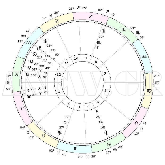 | | ΘΕΣΕΙΣ ΠΛΑΝΗΤΩΝ ΑΣΤΡΟΛΟΓΙΚΟΥ ΧΑΡΤΗ ΤΗΣ ΣΤΙΓΜΗΣ ΑΥΤΗΣ | | | | Πλανήτης | Ζώδιο | Μοίρες | Δεκαήμ. | Σε οίκο | Απόκλιση | | Ακμές των οίκων | | Ηλιος | Υδροχόος | 21°28' | Τρίτο | 1 | 14 S 21 | | 1ος | 13°01' | Υδροχόος | | Σελήνη | Σκορπιός | 28°50' | Τρίτο | 9 | 24 S 56 | | 2ος | 28°36' | Ιχθείς | | Ερμής | Ιχθείς | 05°39' | Πρώτο | 1 | 10 S 15 | | 3ος | 04°43' | Ταύρος | | Αφροδίτη | Υδροχόος | 29°44' | Τρίτο | 1 | 12 S 55 | | 4ος | 01°08' | Δίδυμοι | | Αρης | Υδροχόος | 13°57' | Δεύτερο | 1 | 17 S 39 | | 5ος | 23°10' | Δίδυμοι | | Δίας | Καρκίνος | 16°25'R | Δεύτερο | 6 | 22 N 44 | | 6ος | 15°16' | Καρκίνος | | Κρόνος | Ιχθείς | 29°42' | Τρίτο | 2 | 02 S 06 | | 7ος | 13°01' | Λέων | | Ουρανός | Ταύρος | 27°28' | Τρίτο | 3 | 19 N 25 | | 8ος | 28°36' | Παρθένος | | Ποσειδώνας | Κριός | 00°25' | Πρώτο | 2 | 01 S 02 | | 9ος | 04°43' | Σκορπιός | | Πλούτωνας | Υδροχόος | 03°59' | Πρώτο | 12 | 22 S 58 | | 10ος | 01°08' | Τοξότης | | Β. Δεσμός | Ιχθείς | 10°02' | Δεύτερο | 1 | 07 S 48 | | 11ος | 23°10' | Τοξότης | | Ωροσκόπος | Υδροχόος | 13°01' | Δεύτερο | | | 12ος | 15°16' | Αιγόκερως | | Μεσουράνημα | Τοξότης | 01°08' | Πρώτο | | | |