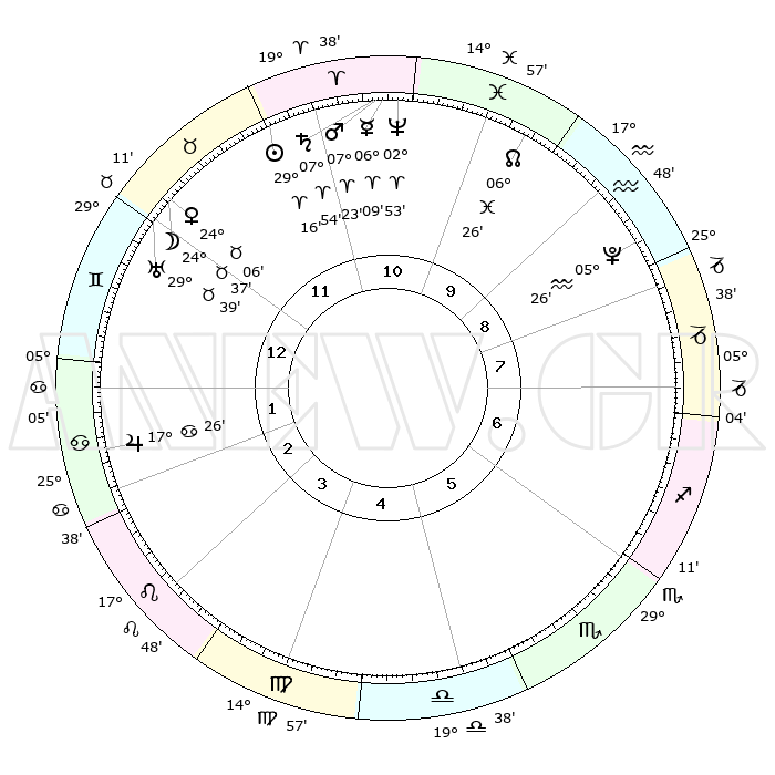 | | ΘΕΣΕΙΣ ΠΛΑΝΗΤΩΝ ΑΣΤΡΟΛΟΓΙΚΟΥ ΧΑΡΤΗ ΤΗΣ ΣΤΙΓΜΗΣ ΑΥΤΗΣ | | | | Πλανήτης | Ζώδιο | Μοίρες | Δεκαήμ. | Σε οίκο | Απόκλιση | | Ακμές των οίκων | | Ηλιος | Κριός | 29°13' | Τρίτο | 11 | 11 N 12 | | 1ος | 13°44' | Δίδυμοι | | Σελήνη | Ταύρος | 23°42' | Τρίτο | 12 | 23 N 29 | | 2ος | 06°10' | Καρκίνος | | Ερμής | Κριός | 06°03' | Πρώτο | 11 | 00 S 01 | | 3ος | 27°23' | Καρκίνος | | Αφροδίτη | Ταύρος | 24°02' | Τρίτο | 12 | 19 N 08 | | 4ος | 21°27' | Λέων | | Αρης | Κριός | 07°20' | Πρώτο | 11 | 02 N 02 | | 5ος | 22°26' | Παρθένος | | Δίας | Καρκίνος | 17°26' | Δεύτερο | 2 | 22 N 41 | | 6ος | 02°28' | Σκορπιός | | Κρόνος | Κριός | 07°54' | Πρώτο | 11 | 01 N 09 | | 7ος | 13°44' | Τοξότης | | Ουρανός | Ταύρος | 29°39' | Τρίτο | 12 | 19 N 54 | | 8ος | 06°10' | Αιγόκερως | | Ποσειδώνας | Κριός | 02°52' | Πρώτο | 11 | 00 S 04 | | 9ος | 27°23' | Αιγόκερως | | Πλούτωνας | Υδροχόος | 05°26' | Πρώτο | 9 | 22 S 47 | | 10ος | 21°27' | Υδροχόος | | Β. Δεσμός | Ιχθείς | 06°26' | Πρώτο | 10 | 09 S 09 | | 11ος | 22°26' | Ιχθείς | | Ωροσκόπος | Δίδυμοι | 13°44' | Δεύτερο | | | 12ος | 02°28' | Ταύρος | | Μεσουράνημα | Υδροχόος | 21°27' | Τρίτο | | | |
