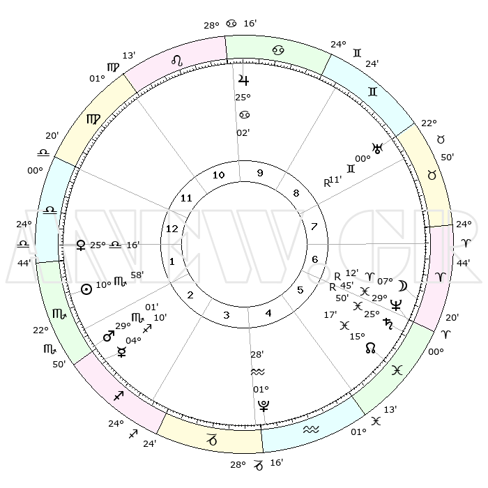 | | ΘΕΣΕΙΣ ΠΛΑΝΗΤΩΝ ΑΣΤΡΟΛΟΓΙΚΟΥ ΧΑΡΤΗ ΤΗΣ ΣΤΙΓΜΗΣ ΑΥΤΗΣ | | | | Πλανήτης | Ζώδιο | Μοίρες | Δεκαήμ. | Σε οίκο | Απόκλιση | | Ακμές των οίκων | | Ηλιος | Σκορπιός | 10°29' | Δεύτερο | 6 | 14 S 58 | | 1ος | 23°17' | Ταύρος | | Σελήνη | Κριός | 00°11' | Πρώτο | 11 | 01 N 09 | | 2ος | 19°32' | Δίδυμοι | | Ερμής | Τοξότης | 03°48' | Πρώτο | 7 | 23 S 45 | | 3ος | 11°15' | Καρκίνος | | Αφροδίτη | Ζυγός | 24°40' | Τρίτο | 6 | 08 S 12 | | 4ος | 03°35' | Λέων | | Αρης | Σκορπιός | 28°40' | Τρίτο | 7 | 20 S 15 | | 5ος | 00°56' | Παρθένος | | Δίας | Καρκίνος | 25°01' | Τρίτο | 3 | 21 N 13 | | 6ος | 08°14' | Ζυγός | | Κρόνος | Ιχθείς | 25°51'R | Τρίτο | 11 | 03 S 54 | | 7ος | 23°17' | Σκορπιός | | Ουρανός | Δίδυμοι | 00°12'R | Πρώτο | 1 | 19 N 59 | | 8ος | 19°32' | Τοξότης | | Ποσειδώνας | Ιχθείς | 29°45'R | Τρίτο | 11 | 01 S 21 | | 9ος | 11°15' | Αιγόκερως | | Πλούτωνας | Υδροχόος | 01°28' | Πρώτο | 9 | 23 S 31 | | 10ος | 03°35' | Υδροχόος | | Β. Δεσμός | Ιχθείς | 15°19' | Δεύτερο | 11 | 05 S 47 | | 11ος | 00°56' | Ιχθείς | | Ωροσκόπος | Ταύρος | 23°17' | Τρίτο | | | 12ος | 08°14' | Κριός | | Μεσουράνημα | Υδροχόος | 03°35' | Πρώτο | | | |