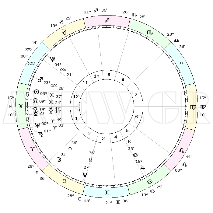 | | ΘΕΣΕΙΣ ΠΛΑΝΗΤΩΝ ΑΣΤΡΟΛΟΓΙΚΟΥ ΧΑΡΤΗ ΤΗΣ ΣΤΙΓΜΗΣ ΑΥΤΗΣ | | | | Πλανήτης | Ζώδιο | Μοίρες | Δεκαήμ. | Σε οίκο | Απόκλιση | | Ακμές των οίκων | | Ηλιος | Ιχθείς | 03°32' | Πρώτο | 1 | 10 S 12 | | 1ος | 06°56' | Υδροχόος | | Σελήνη | Ταύρος | 02°34' | Πρώτο | 3 | 16 N 21 | | 2ος | 22°00' | Ιχθείς | | Ερμής | Ιχθείς | 21°11' | Τρίτο | 1 | 01 S 50 | | 3ος | 29°16' | Κριός | | Αφροδίτη | Ιχθείς | 14°42' | Δεύτερο | 1 | 07 S 21 | | 4ος | 26°35' | Ταύρος | | Αρης | Υδροχόος | 23°22' | Τρίτο | 1 | 14 S 45 | | 5ος | 18°54' | Δίδυμοι | | Δίας | Καρκίνος | 15°33'R | Δεύτερο | 6 | 22 N 52 | | 6ος | 10°38' | Καρκίνος | | Κρόνος | Κριός | 01°02' | Πρώτο | 2 | 01 S 33 | | 7ος | 06°56' | Λέων | | Ουρανός | Ταύρος | 27°36' | Τρίτο | 4 | 19 N 27 | | 8ος | 22°00' | Παρθένος | | Ποσειδώνας | Κριός | 00°48' | Πρώτο | 2 | 00 S 53 | | 9ος | 29°16' | Ζυγός | | Πλούτωνας | Υδροχόος | 04°21' | Πρώτο | 12 | 22 S 54 | | 10ος | 26°35' | Σκορπιός | | Β. Δεσμός | Ιχθείς | 09°24' | Πρώτο | 1 | 08 S 02 | | 11ος | 18°54' | Τοξότης | | Ωροσκόπος | Υδροχόος | 06°56' | Πρώτο | | | 12ος | 10°38' | Αιγόκερως | | Μεσουράνημα | Σκορπιός | 26°35' | Τρίτο | | | |