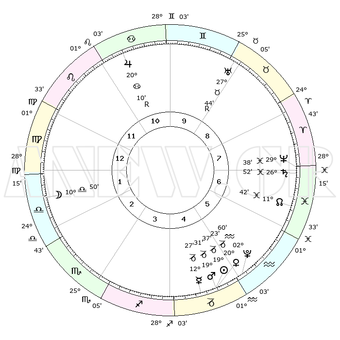 | | ΘΕΣΕΙΣ ΠΛΑΝΗΤΩΝ ΑΣΤΡΟΛΟΓΙΚΟΥ ΧΑΡΤΗ ΤΗΣ ΣΤΙΓΜΗΣ ΑΥΤΗΣ | | | | Πλανήτης | Ζώδιο | Μοίρες | Δεκαήμ. | Σε οίκο | Απόκλιση | | Ακμές των οίκων | | Ηλιος | Αιγόκερως | 18°56' | Δεύτερο | 1 | 22 S 06 | | 1ος | 08°44' | Αιγόκερως | | Σελήνη | Ζυγός | 02°37' | Πρώτο | 9 | 02 S 50 | | 2ος | 18°07' | Υδροχόος | | Ερμής | Αιγόκερως | 11°24' | Δεύτερο | 1 | 24 S 19 | | 3ος | 28°26' | Ιχθείς | | Αφροδίτη | Αιγόκερως | 19°33' | Δεύτερο | 1 | 22 S 48 | | 4ος | 00°50' | Ταύρος | | Αρης | Αιγόκερως | 19°01' | Δεύτερο | 1 | 23 S 01 | | 5ος | 25°51' | Ταύρος | | Δίας | Καρκίνος | 20°15'R | Τρίτο | 7 | 22 N 10 | | 6ος | 17°13' | Δίδυμοι | | Κρόνος | Ιχθείς | 26°49' | Τρίτο | 2 | 03 S 19 | | 7ος | 08°44' | Καρκίνος | | Ουρανός | Ταύρος | 27°45'R | Τρίτο | 5 | 19 N 28 | | 8ος | 18°07' | Λέων | | Ποσειδώνας | Ιχθείς | 29°38' | Τρίτο | 3 | 01 S 22 | | 9ος | 28°26' | Παρθένος | | Πλούτωνας | Υδροχόος | 02°59' | Πρώτο | 1 | 23 S 10 | | 10ος | 00°50' | Σκορπιός | | Β. Δεσμός | Ιχθείς | 11°44' | Δεύτερο | 2 | 07 S 10 | | 11ος | 25°51' | Σκορπιός | | Ωροσκόπος | Αιγόκερως | 08°44' | Πρώτο | | | 12ος | 17°14' | Τοξότης | | Μεσουράνημα | Σκορπιός | 00°50' | Πρώτο | | | |