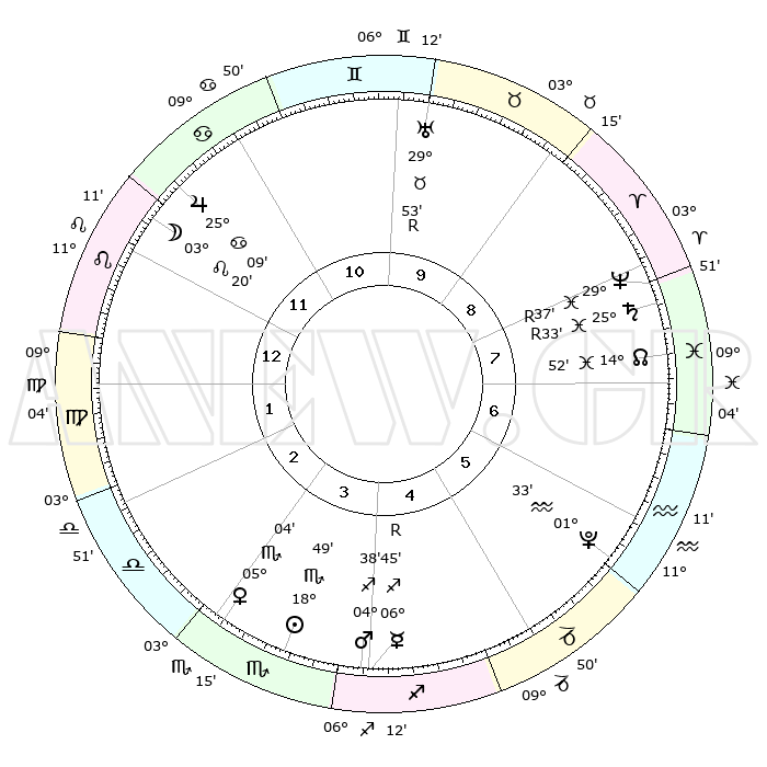| | ΘΕΣΕΙΣ ΠΛΑΝΗΤΩΝ ΑΣΤΡΟΛΟΓΙΚΟΥ ΧΑΡΤΗ ΤΗΣ ΣΤΙΓΜΗΣ ΑΥΤΗΣ | | | | Πλανήτης | Ζώδιο | Μοίρες | Δεκαήμ. | Σε οίκο | Απόκλιση | | Ακμές των οίκων | | Ηλιος | Σκορπιός | 18°44' | Δεύτερο | 4 | 17 S 24 | | 1ος | 14°27' | Λέων | | Σελήνη | Λέων | 02°10' | Πρώτο | 12 | 23 N 07 | | 2ος | 06°42' | Παρθένος | | Ερμής | Τοξότης | 06°46'R | Πρώτο | 4 | 23 S 35 | | 3ος | 03°40' | Ζυγός | | Αφροδίτη | Σκορπιός | 04°57' | Πρώτο | 3 | 11 S 56 | | 4ος | 06°03' | Σκορπιός | | Αρης | Τοξότης | 04°34' | Πρώτο | 4 | 21 S 32 | | 5ος | 11°22' | Τοξότης | | Δίας | Καρκίνος | 25°09' | Τρίτο | 12 | 21 N 12 | | 6ος | 14°56' | Αιγόκερως | | Κρόνος | Ιχθείς | 25°33'R | Τρίτο | 8 | 04 S 00 | | 7ος | 14°27' | Υδροχόος | | Ουρανός | Ταύρος | 29°53'R | Τρίτο | 10 | 19 N 55 | | 8ος | 06°42' | Ιχθείς | | Ποσειδώνας | Ιχθείς | 29°37'R | Τρίτο | 8 | 01 S 24 | | 9ος | 03°40' | Κριός | | Πλούτωνας | Υδροχόος | 01°33' | Πρώτο | 6 | 23 S 29 | | 10ος | 06°03' | Ταύρος | | Β. Δεσμός | Ιχθείς | 14°53' | Δεύτερο | 8 | 05 S 57 | | 11ος | 11°22' | Δίδυμοι | | Ωροσκόπος | Λέων | 14°27' | Δεύτερο | | | 12ος | 14°55' | Καρκίνος | | Μεσουράνημα | Ταύρος | 06°03' | Πρώτο | | | |