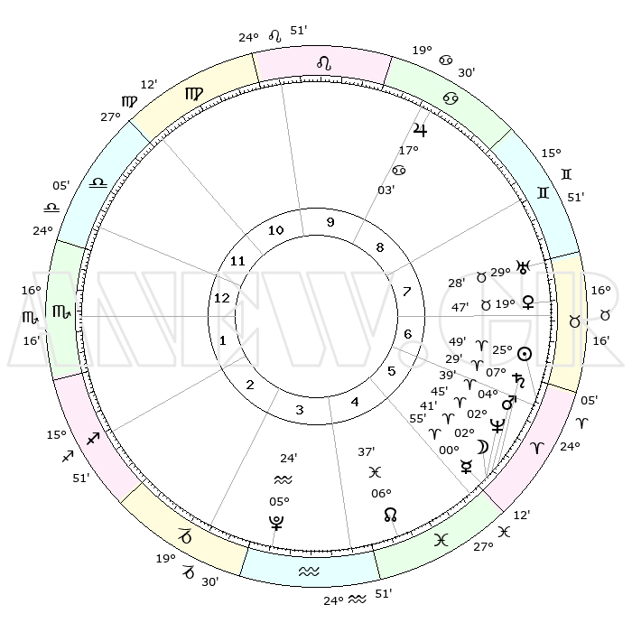 | | ΘΕΣΕΙΣ ΠΛΑΝΗΤΩΝ ΑΣΤΡΟΛΟΓΙΚΟΥ ΧΑΡΤΗ ΤΗΣ ΣΤΙΓΜΗΣ ΑΥΤΗΣ | | | | Πλανήτης | Ζώδιο | Μοίρες | Δεκαήμ. | Σε οίκο | Απόκλιση | | Ακμές των οίκων | | Ηλιος | Κριός | 25°45' | Τρίτο | 6 | 09 N 57 | | 1ος | 28°08' | Ζυγός | | Σελήνη | Κριός | 01°48' | Πρώτο | 5 | 02 N 37 | | 2ος | 26°26' | Σκορπιός | | Ερμής | Κριός | 00°49' | Πρώτο | 5 | 02 S 04 | | 3ος | 28°15' | Τοξότης | | Αφροδίτη | Ταύρος | 19°42' | Δεύτερο | 7 | 17 N 51 | | 4ος | 02°19' | Υδροχόος | | Αρης | Κριός | 04°36' | Πρώτο | 6 | 00 N 56 | | 5ος | 05°15' | Ιχθείς | | Δίας | Καρκίνος | 17°02' | Δεύτερο | 9 | 22 N 43 | | 6ος | 04°05' | Κριός | | Κρόνος | Κριός | 07°28' | Πρώτο | 6 | 01 N 00 | | 7ος | 28°08' | Κριός | | Ουρανός | Ταύρος | 29°28' | Τρίτο | 8 | 19 N 52 | | 8ος | 26°26' | Ταύρος | | Ποσειδώνας | Κριός | 02°45' | Πρώτο | 5 | 00 S 07 | | 9ος | 28°15' | Δίδυμοι | | Πλούτωνας | Υδροχόος | 05°24' | Πρώτο | 4 | 22 S 47 | | 10ος | 02°19' | Λέων | | Β. Δεσμός | Ιχθείς | 06°37' | Πρώτο | 5 | 09 S 05 | | 11ος | 05°15' | Παρθένος | | Ωροσκόπος | Ζυγός | 28°08' | Τρίτο | | | 12ος | 04°05' | Ζυγός | | Μεσουράνημα | Λέων | 02°19' | Πρώτο | | | |