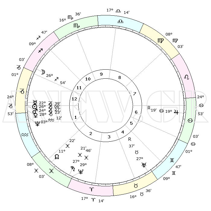 | | ΘΕΣΕΙΣ ΠΛΑΝΗΤΩΝ ΑΣΤΡΟΛΟΓΙΚΟΥ ΧΑΡΤΗ ΤΗΣ ΣΤΙΓΜΗΣ ΑΥΤΗΣ | | | | Πλανήτης | Ζώδιο | Μοίρες | Δεκαήμ. | Σε οίκο | Απόκλιση | | Ακμές των οίκων | | Ηλιος | Αιγόκερως | 25°60' | Τρίτο | 2 | 20 S 57 | | 1ος | 19°49' | Τοξότης | | Σελήνη | Τοξότης | 25°42' | Τρίτο | 1 | 28 S 18 | | 2ος | 24°32' | Αιγόκερως | | Ερμής | Αιγόκερως | 22°29' | Τρίτο | 1 | 23 S 23 | | 3ος | 03°27' | Ιχθείς | | Αφροδίτη | Αιγόκερως | 28°16' | Τρίτο | 2 | 21 S 30 | | 4ος | 08°45' | Κριός | | Αρης | Αιγόκερως | 24°22' | Τρίτο | 1 | 22 S 12 | | 5ος | 06°45' | Ταύρος | | Δίας | Καρκίνος | 19°20'R | Δεύτερο | 7 | 22 N 19 | | 6ος | 29°23' | Ταύρος | | Κρόνος | Ιχθείς | 27°20' | Τρίτο | 3 | 03 S 05 | | 7ος | 19°49' | Δίδυμοι | | Ουρανός | Ταύρος | 27°37'R | Τρίτο | 5 | 19 N 26 | | 8ος | 24°32' | Καρκίνος | | Ποσειδώνας | Ιχθείς | 29°46' | Τρίτο | 3 | 01 S 19 | | 9ος | 03°27' | Παρθένος | | Πλούτωνας | Υδροχόος | 03°12' | Πρώτο | 2 | 23 S 07 | | 10ος | 08°45' | Ζυγός | | Β. Δεσμός | Ιχθείς | 11°22' | Δεύτερο | 3 | 07 S 18 | | 11ος | 06°45' | Σκορπιός | | Ωροσκόπος | Τοξότης | 19°49' | Δεύτερο | | | 12ος | 29°23' | Σκορπιός | | Μεσουράνημα | Ζυγός | 08°45' | Πρώτο | | | |