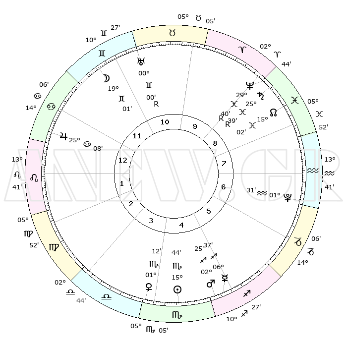 | | ΘΕΣΕΙΣ ΠΛΑΝΗΤΩΝ ΑΣΤΡΟΛΟΓΙΚΟΥ ΧΑΡΤΗ ΤΗΣ ΣΤΙΓΜΗΣ ΑΥΤΗΣ | | | | Πλανήτης | Ζώδιο | Μοίρες | Δεκαήμ. | Σε οίκο | Απόκλιση | | Ακμές των οίκων | | Ηλιος | Σκορπιός | 15°32' | Δεύτερο | 6 | 16 S 29 | | 1ος | 12°59' | Δίδυμοι | | Σελήνη | Δίδυμοι | 16°06' | Δεύτερο | 1 | 27 N 45 | | 2ος | 05°32' | Καρκίνος | | Ερμής | Τοξότης | 06°33' | Πρώτο | 6 | 23 S 59 | | 3ος | 26°44' | Καρκίνος | | Αφροδίτη | Σκορπιός | 00°58' | Πρώτο | 5 | 10 S 31 | | 4ος | 20°42' | Λέων | | Αρης | Τοξότης | 02°17' | Πρώτο | 6 | 21 S 03 | | 5ος | 21°33' | Παρθένος | | Δίας | Καρκίνος | 25°08' | Τρίτο | 2 | 21 N 12 | | 6ος | 01°32' | Σκορπιός | | Κρόνος | Ιχθείς | 25°39'R | Τρίτο | 11 | 03 S 58 | | 7ος | 12°59' | Τοξότης | | Ουρανός | Δίδυμοι | 00°01'R | Πρώτο | 12 | 19 N 57 | | 8ος | 05°31' | Αιγόκερως | | Ποσειδώνας | Ιχθείς | 29°40'R | Τρίτο | 11 | 01 S 23 | | 9ος | 26°44' | Αιγόκερως | | Πλούτωνας | Υδροχόος | 01°31' | Πρώτο | 9 | 23 S 30 | | 10ος | 20°42' | Υδροχόος | | Β. Δεσμός | Ιχθείς | 15°03' | Δεύτερο | 10 | 05 S 53 | | 11ος | 21°33' | Ιχθείς | | Ωροσκόπος | Δίδυμοι | 12°59' | Δεύτερο | | | 12ος | 01°32' | Ταύρος | | Μεσουράνημα | Υδροχόος | 20°42' | Τρίτο | | | |