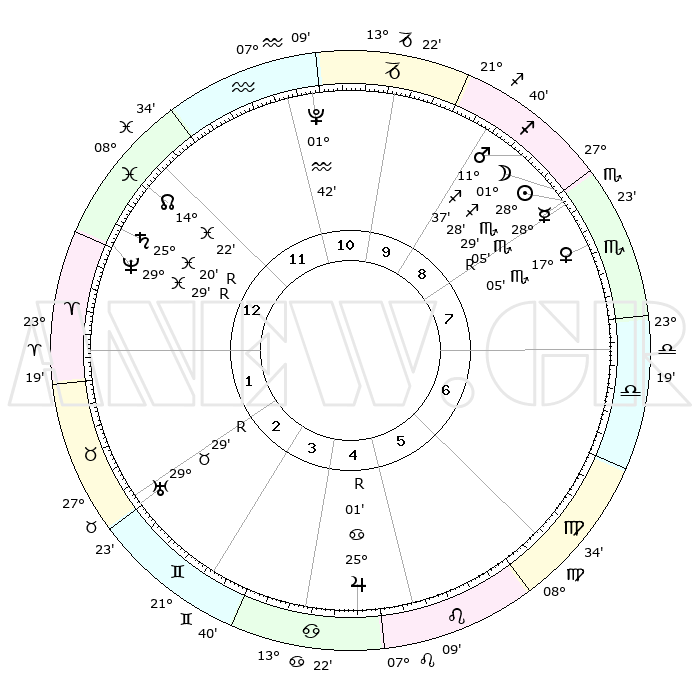 | | ΘΕΣΕΙΣ ΠΛΑΝΗΤΩΝ ΑΣΤΡΟΛΟΓΙΚΟΥ ΧΑΡΤΗ ΤΗΣ ΣΤΙΓΜΗΣ ΑΥΤΗΣ | | | | Πλανήτης | Ζώδιο | Μοίρες | Δεκαήμ. | Σε οίκο | Απόκλιση | | Ακμές των οίκων | | Ηλιος | Σκορπιός | 28°25' | Τρίτο | 8 | 19 S 48 | | 1ος | 15°44' | Ιχθείς | | Σελήνη | Τοξότης | 00°42' | Πρώτο | 9 | 25 S 02 | | 2ος | 29°04' | Κριός | | Ερμής | Σκορπιός | 28°10'R | Τρίτο | 8 | 19 S 11 | | 3ος | 28°50' | Ταύρος | | Αφροδίτη | Σκορπιός | 17°00' | Δεύτερο | 8 | 15 S 54 | | 4ος | 21°56' | Δίδυμοι | | Αρης | Τοξότης | 11°34' | Δεύτερο | 9 | 22 S 44 | | 5ος | 13°46' | Καρκίνος | | Δίας | Καρκίνος | 25°01'R | Τρίτο | 5 | 21 N 15 | | 6ος | 09°09' | Λέων | | Κρόνος | Ιχθείς | 25°20'R | Τρίτο | 1 | 04 S 04 | | 7ος | 15°44' | Παρθένος | | Ουρανός | Ταύρος | 29°29'R | Τρίτο | 3 | 19 N 50 | | 8ος | 29°04' | Ζυγός | | Ποσειδώνας | Ιχθείς | 29°29'R | Τρίτο | 1 | 01 S 27 | | 9ος | 28°50' | Σκορπιός | | Πλούτωνας | Υδροχόος | 01°42' | Πρώτο | 11 | 23 S 27 | | 10ος | 21°56' | Τοξότης | | Β. Δεσμός | Ιχθείς | 14°22' | Δεύτερο | 12 | 06 S 09 | | 11ος | 13°46' | Αιγόκερως | | Ωροσκόπος | Ιχθείς | 15°44' | Δεύτερο | | | 12ος | 09°09' | Υδροχόος | | Μεσουράνημα | Τοξότης | 21°56' | Τρίτο | | | |