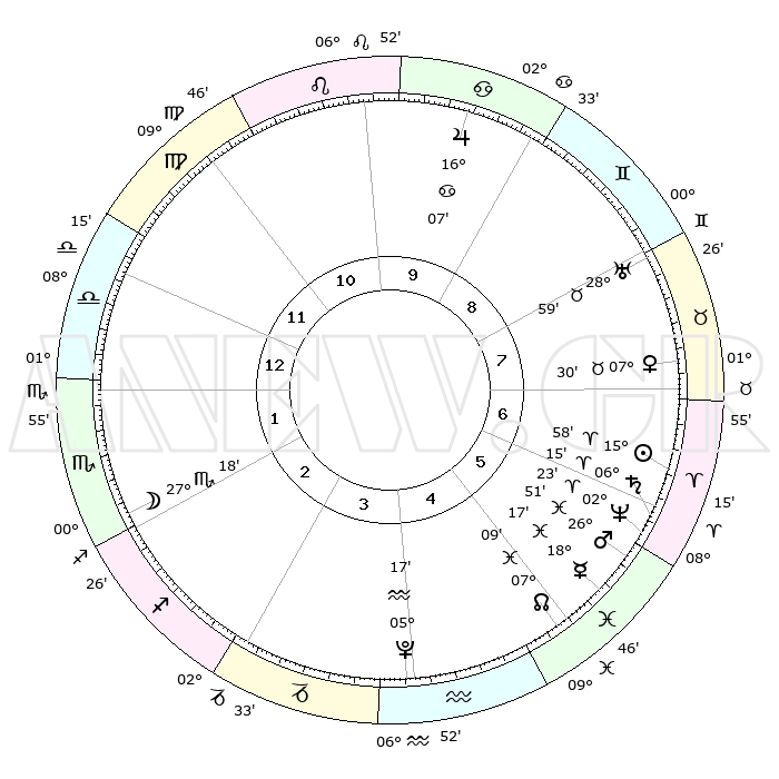 | | ΘΕΣΕΙΣ ΠΛΑΝΗΤΩΝ ΑΣΤΡΟΛΟΓΙΚΟΥ ΧΑΡΤΗ ΤΗΣ ΣΤΙΓΜΗΣ ΑΥΤΗΣ | | | | Πλανήτης | Ζώδιο | Μοίρες | Δεκαήμ. | Σε οίκο | Απόκλιση | | Ακμές των οίκων | | Ηλιος | Κριός | 15°53' | Δεύτερο | 7 | 06 N 15 | | 1ος | 06°53' | Ζυγός | | Σελήνη | Σκορπιός | 26°17' | Τρίτο | 2 | 24 S 13 | | 2ος | 03°57' | Σκορπιός | | Ερμής | Ιχθείς | 18°12' | Δεύτερο | 6 | 06 S 27 | | 3ος | 04°39' | Τοξότης | | Αφροδίτη | Ταύρος | 07°24' | Πρώτο | 8 | 13 N 45 | | 4ος | 07°45' | Αιγόκερως | | Αρης | Ιχθείς | 26°47' | Τρίτο | 6 | 02 S 13 | | 5ος | 10°41' | Υδροχόος | | Δίας | Καρκίνος | 16°07' | Δεύτερο | 10 | 22 N 50 | | 6ος | 10°50' | Ιχθείς | | Κρόνος | Κριός | 06°14' | Πρώτο | 6 | 00 N 31 | | 7ος | 06°53' | Κριός | | Ουρανός | Ταύρος | 28°58' | Τρίτο | 8 | 19 N 45 | | 8ος | 03°57' | Ταύρος | | Ποσειδώνας | Κριός | 02°23' | Πρώτο | 6 | 00 S 15 | | 9ος | 04°39' | Δίδυμοι | | Πλούτωνας | Υδροχόος | 05°17' | Πρώτο | 4 | 22 S 47 | | 10ος | 07°45' | Καρκίνος | | Β. Δεσμός | Ιχθείς | 07°09' | Πρώτο | 5 | 08 S 53 | | 11ος | 10°41' | Λέων | | Ωροσκόπος | Ζυγός | 06°53' | Πρώτο | | | 12ος | 10°50' | Παρθένος | | Μεσουράνημα | Καρκίνος | 07°45' | Πρώτο | | | |