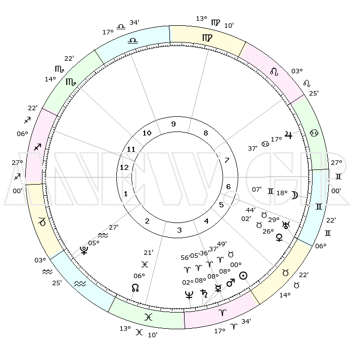 | | ΘΕΣΕΙΣ ΠΛΑΝΗΤΩΝ ΑΣΤΡΟΛΟΓΙΚΟΥ ΧΑΡΤΗ ΤΗΣ ΣΤΙΓΜΗΣ ΑΥΤΗΣ | | | | Πλανήτης | Ζώδιο | Μοίρες | Δεκαήμ. | Σε οίκο | Απόκλιση | | Ακμές των οίκων | | Ηλιος | Ταύρος | 00°45' | Πρώτο | 5 | 11 N 44 | | 1ος | 05°38' | Τοξότης | | Σελήνη | Δίδυμοι | 17°05' | Δεύτερο | 7 | 27 N 49 | | 2ος | 07°36' | Αιγόκερως | | Ερμής | Κριός | 08°30' | Πρώτο | 4 | 00 N 58 | | 3ος | 14°15' | Υδροχόος | | Αφροδίτη | Ταύρος | 25°57' | Τρίτο | 6 | 19 N 40 | | 4ος | 20°20' | Ιχθείς | | Αρης | Κριός | 08°33' | Πρώτο | 4 | 02 N 31 | | 5ος | 20°37' | Κριός | | Δίας | Καρκίνος | 17°37' | Δεύτερο | 8 | 22 N 39 | | 6ος | 14°55' | Ταύρος | | Κρόνος | Κριός | 08°05' | Πρώτο | 4 | 01 N 14 | | 7ος | 05°38' | Δίδυμοι | | Ουρανός | Ταύρος | 29°44' | Τρίτο | 6 | 19 N 55 | | 8ος | 07°36' | Καρκίνος | | Ποσειδώνας | Κριός | 02°56' | Πρώτο | 4 | 00 S 03 | | 9ος | 14°15' | Λέων | | Πλούτωνας | Υδροχόος | 05°27' | Πρώτο | 2 | 22 S 48 | | 10ος | 20°20' | Παρθένος | | Β. Δεσμός | Ιχθείς | 06°21' | Πρώτο | 3 | 09 S 11 | | 11ος | 20°37' | Ζυγός | | Ωροσκόπος | Τοξότης | 05°38' | Πρώτο | | | 12ος | 14°55' | Σκορπιός | | Μεσουράνημα | Παρθένος | 20°20' | Τρίτο | | | |