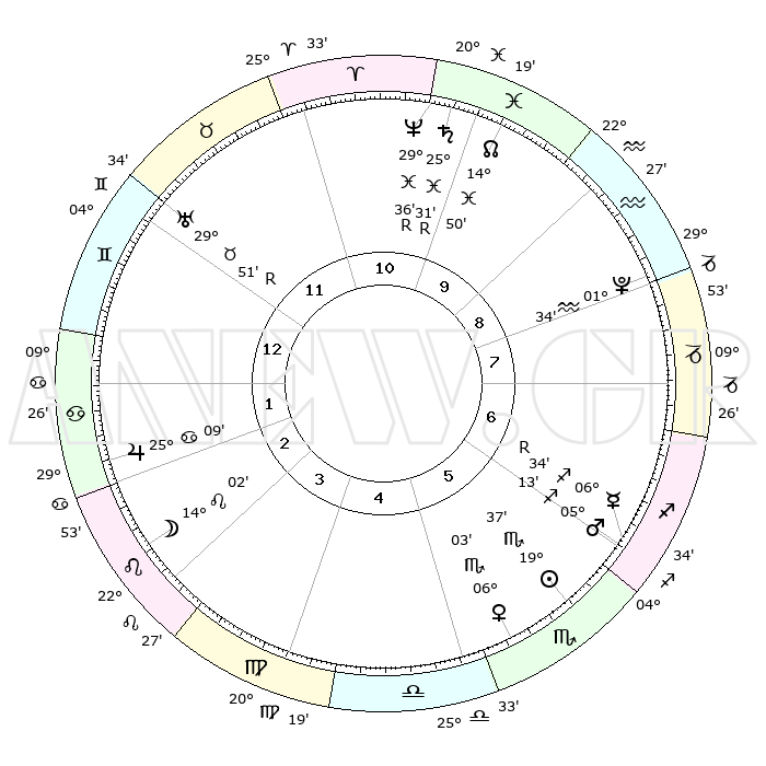 | | ΘΕΣΕΙΣ ΠΛΑΝΗΤΩΝ ΑΣΤΡΟΛΟΓΙΚΟΥ ΧΑΡΤΗ ΤΗΣ ΣΤΙΓΜΗΣ ΑΥΤΗΣ | | | | Πλανήτης | Ζώδιο | Μοίρες | Δεκαήμ. | Σε οίκο | Απόκλιση | | Ακμές των οίκων | | Ηλιος | Σκορπιός | 19°33' | Δεύτερο | 6 | 17 S 37 | | 1ος | 15°15' | Δίδυμοι | | Σελήνη | Λέων | 13°05' | Δεύτερο | 3 | 19 N 33 | | 2ος | 07°29' | Καρκίνος | | Ερμής | Τοξότης | 06°35'R | Πρώτο | 6 | 23 S 24 | | 3ος | 28°43' | Καρκίνος | | Αφροδίτη | Σκορπιός | 05°58' | Πρώτο | 6 | 12 S 18 | | 4ος | 22°57' | Λέων | | Αρης | Τοξότης | 05°10' | Πρώτο | 6 | 21 S 38 | | 5ος | 24°14' | Παρθένος | | Δίας | Καρκίνος | 25°09' | Τρίτο | 2 | 21 N 12 | | 6ος | 04°21' | Σκορπιός | | Κρόνος | Ιχθείς | 25°31'R | Τρίτο | 11 | 04 S 01 | | 7ος | 15°15' | Τοξότης | | Ουρανός | Ταύρος | 29°51'R | Τρίτο | 12 | 19 N 55 | | 8ος | 07°29' | Αιγόκερως | | Ποσειδώνας | Ιχθείς | 29°36'R | Τρίτο | 11 | 01 S 25 | | 9ος | 28°43' | Αιγόκερως | | Πλούτωνας | Υδροχόος | 01°34' | Πρώτο | 9 | 23 S 29 | | 10ος | 22°57' | Υδροχόος | | Β. Δεσμός | Ιχθείς | 14°50' | Δεύτερο | 10 | 05 S 58 | | 11ος | 24°14' | Ιχθείς | | Ωροσκόπος | Δίδυμοι | 15°15' | Δεύτερο | | | 12ος | 04°21' | Ταύρος | | Μεσουράνημα | Υδροχόος | 22°57' | Τρίτο | | | |