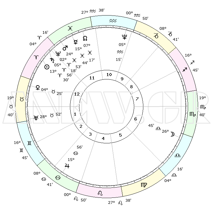 | | ΘΕΣΕΙΣ ΠΛΑΝΗΤΩΝ ΑΣΤΡΟΛΟΓΙΚΟΥ ΧΑΡΤΗ ΤΗΣ ΣΤΙΓΜΗΣ ΑΥΤΗΣ | | | | Πλανήτης | Ζώδιο | Μοίρες | Δεκαήμ. | Σε οίκο | Απόκλιση | | Ακμές των οίκων | | Ηλιος | Κριός | 13°25' | Δεύτερο | 1 | 05 N 18 | | 1ος | 08°06' | Κριός | | Σελήνη | Ζυγός | 25°47' | Τρίτο | 7 | 13 S 30 | | 2ος | 16°21' | Ταύρος | | Ερμής | Ιχθείς | 15°39' | Δεύτερο | 12 | 07 S 09 | | 3ος | 12°33' | Δίδυμοι | | Αφροδίτη | Ταύρος | 04°19' | Πρώτο | 1 | 12 N 37 | | 4ος | 04°33' | Καρκίνος | | Αρης | Ιχθείς | 24°49' | Τρίτο | 12 | 03 S 01 | | 5ος | 27°16' | Καρκίνος | | Δίας | Καρκίνος | 15°56' | Δεύτερο | 4 | 22 N 51 | | 6ος | 25°58' | Λέων | | Κρόνος | Κριός | 05°56' | Πρώτο | 12 | 00 N 24 | | 7ος | 08°06' | Ζυγός | | Ουρανός | Ταύρος | 28°52' | Τρίτο | 2 | 19 N 44 | | 8ος | 16°21' | Σκορπιός | | Ποσειδώνας | Κριός | 02°17' | Πρώτο | 12 | 00 S 17 | | 9ος | 12°33' | Τοξότης | | Πλούτωνας | Υδροχόος | 05°15' | Πρώτο | 11 | 22 S 47 | | 10ος | 04°33' | Αιγόκερως | | Β. Δεσμός | Ιχθείς | 07°17' | Πρώτο | 12 | 08 S 50 | | 11ος | 27°16' | Αιγόκερως | | Ωροσκόπος | Κριός | 08°06' | Πρώτο | | | 12ος | 25°58' | Υδροχόος | | Μεσουράνημα | Αιγόκερως | 04°33' | Πρώτο | | | |