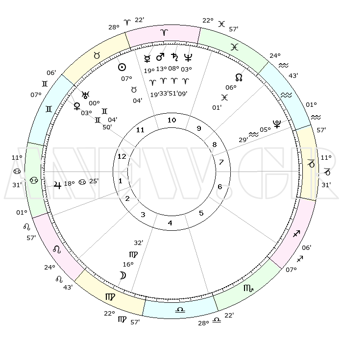 | | ΘΕΣΕΙΣ ΠΛΑΝΗΤΩΝ ΑΣΤΡΟΛΟΓΙΚΟΥ ΧΑΡΤΗ ΤΗΣ ΣΤΙΓΜΗΣ ΑΥΤΗΣ | | | | Πλανήτης | Ζώδιο | Μοίρες | Δεκαήμ. | Σε οίκο | Απόκλιση | | Ακμές των οίκων | | Ηλιος | Ταύρος | 07°00' | Πρώτο | 11 | 13 N 51 | | 1ος | 17°42' | Δίδυμοι | | Σελήνη | Παρθένος | 15°37' | Δεύτερο | 4 | 05 N 00 | | 2ος | 09°37' | Καρκίνος | | Ερμής | Κριός | 19°11' | Δεύτερο | 11 | 05 N 24 | | 3ος | 00°54' | Λέων | | Αφροδίτη | Δίδυμοι | 03°45' | Πρώτο | 12 | 21 N 37 | | 4ος | 25°26' | Λέων | | Αρης | Κριός | 13°30' | Δεύτερο | 11 | 04 N 29 | | 5ος | 27°11' | Παρθένος | | Δίας | Καρκίνος | 18°25' | Δεύτερο | 2 | 22 N 33 | | 6ος | 07°25' | Σκορπιός | | Κρόνος | Κριός | 08°50' | Πρώτο | 11 | 01 N 31 | | 7ος | 17°42' | Τοξότης | | Ουρανός | Δίδυμοι | 00°04' | Πρώτο | 12 | 20 N 00 | | 8ος | 09°37' | Αιγόκερως | | Ποσειδώνας | Κριός | 03°09' | Πρώτο | 11 | 00 N 02 | | 9ος | 00°54' | Υδροχόος | | Πλούτωνας | Υδροχόος | 05°29' | Πρώτο | 9 | 22 S 48 | | 10ος | 25°26' | Υδροχόος | | Β. Δεσμός | Ιχθείς | 06°01' | Πρώτο | 10 | 09 S 18 | | 11ος | 27°11' | Ιχθείς | | Ωροσκόπος | Δίδυμοι | 17°42' | Δεύτερο | | | 12ος | 07°25' | Ταύρος | | Μεσουράνημα | Υδροχόος | 25°26' | Τρίτο | | | |